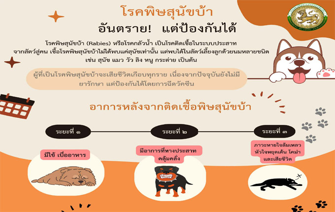 เพื่อเป็นการเฝ้าระวังและป้องกันโรคพิษสุนัขบ้า จึงประชาสัมพันธ์การป้องกันโรคพิษสุนัขบ้า และสร้างการรับรู้ให้ประชาชนในพื้นที่ทราบ ดังนี้