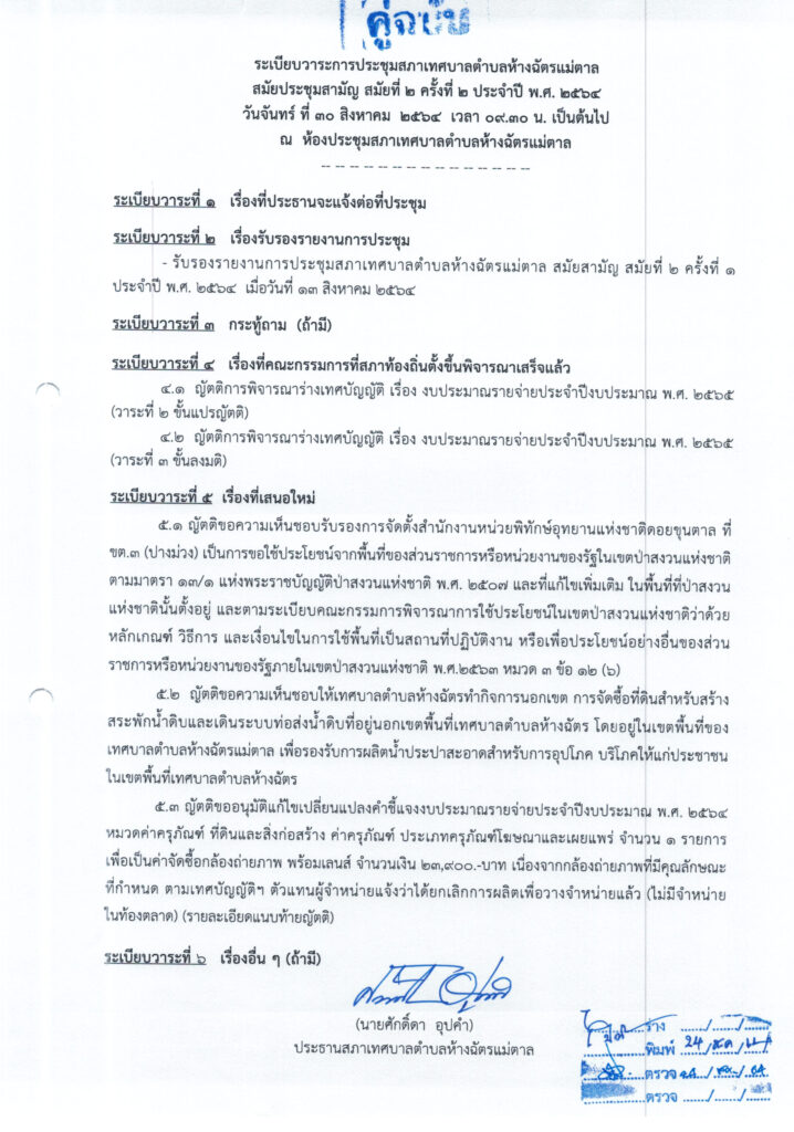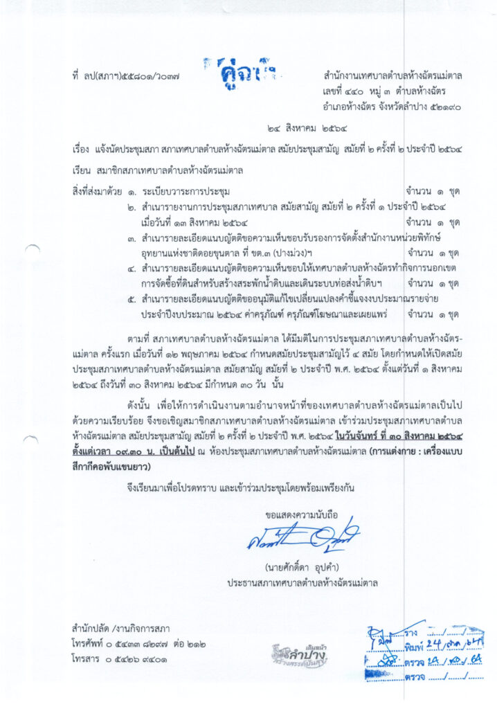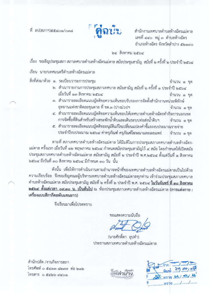 • แจ้งนัดประชุมสภา สมัยสามัญ สมัยที่ 2 ครั้งที่ 2 ประจำปี 2564 (30 สิงหาคม 2564)