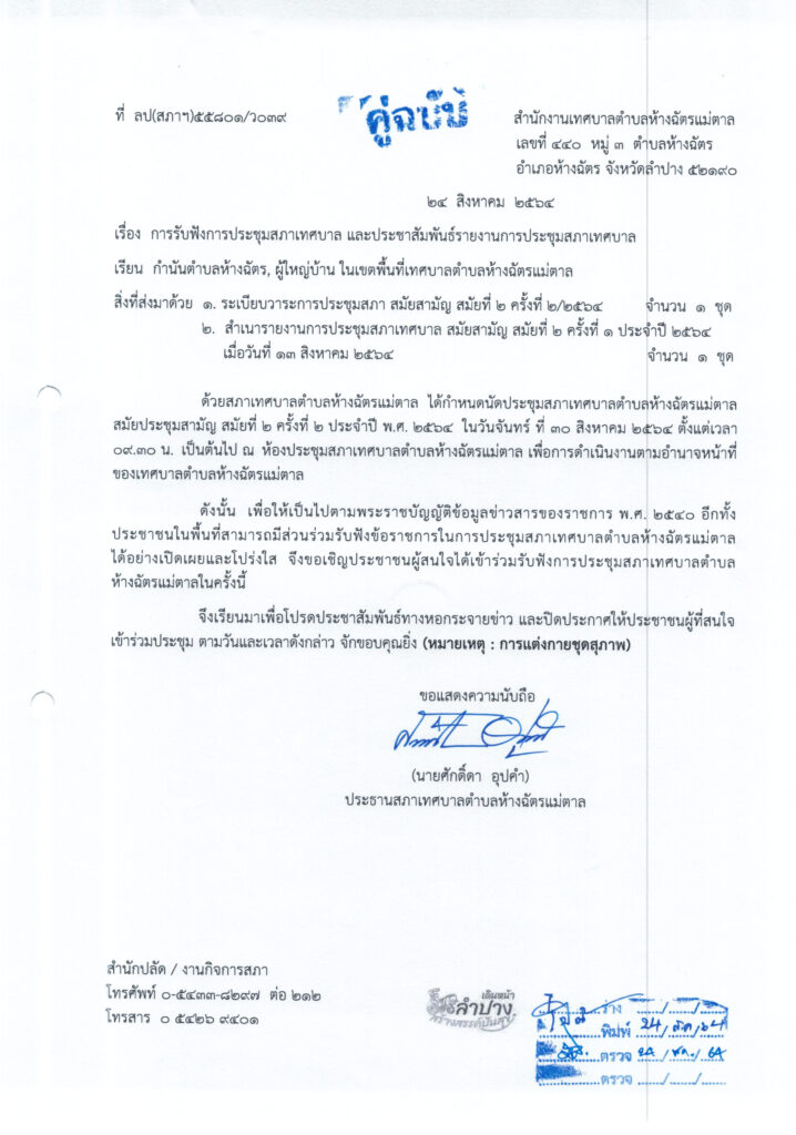 แจ้งนัดประชุมสภา สมัยสามัญ สมัยที่ 2 ครั้งที่ 2 ประจำปี 2564 (30 สิงหาคม 2564)