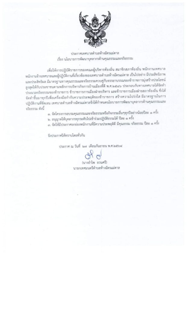 • ประกาศ เรื่อง นโยบายการพัฒนาบุคลากรด้านคุณธรรมและจริยธรรม