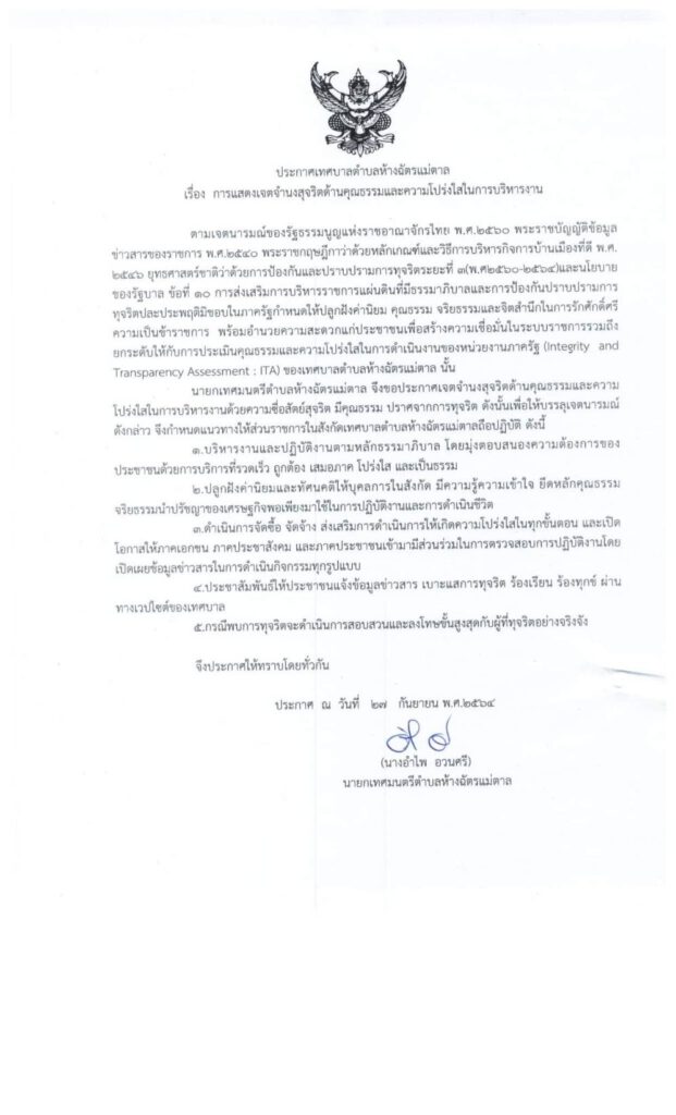 ประกาศ เรื่อง การแสดงเจตจำนงสุจริตด้านคุณธรรมและความโปร่งใสในการบริหารงาน