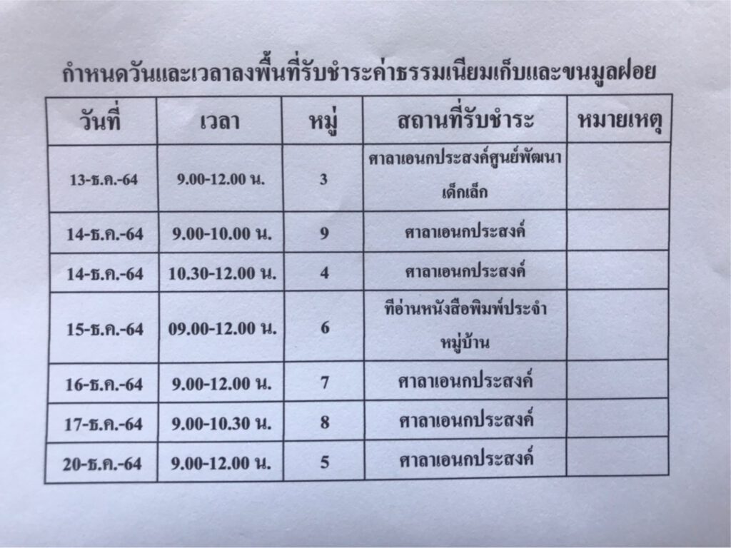 กำหนดวันและเวลาลงพื้นที่รับชำระค่าธรรมเนียมเก็บและขนมูลฝอย ประจำเดือนธันวาคม2564