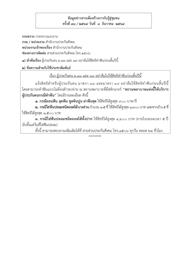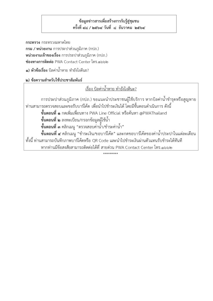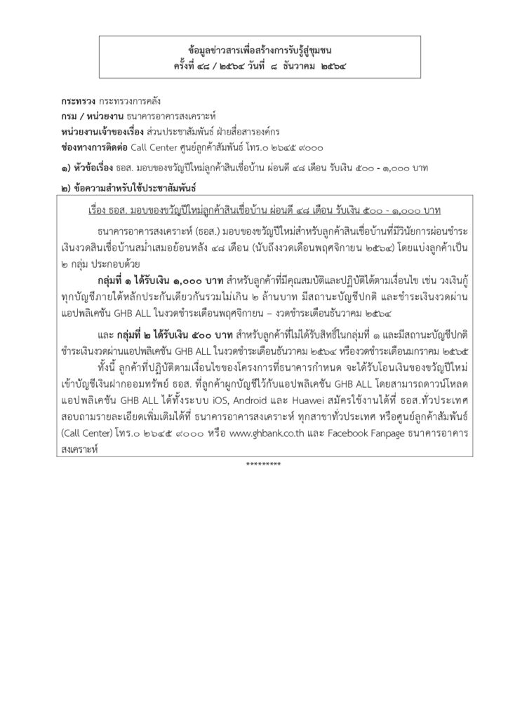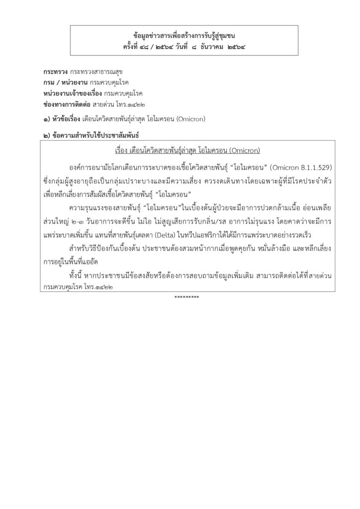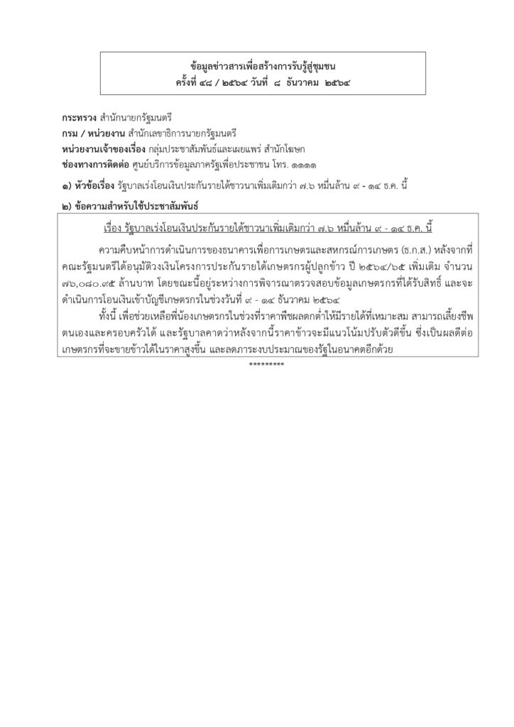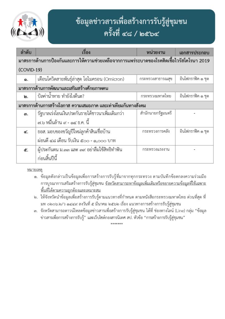• ข้อมูลข่าวสารเพื่อสร้างการรับรู้สู่ชุมชนครั้งที่ 48/2564