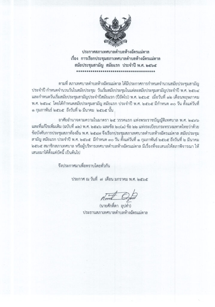 • ประกาศเรียกประชุมสภา สมัยสามัญ สมัยแรก ประจำปี พ.ศ. 2565