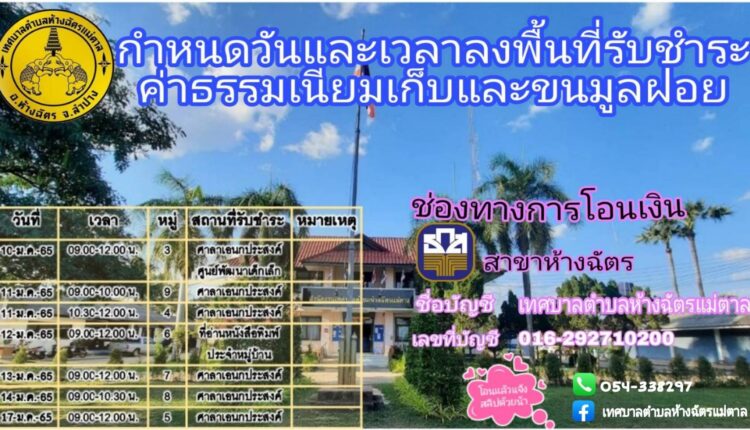 กำหนดวันและเวลาลงพื้นที่รับชำระค่าธรรมเนียมเก็บและขนมูลฝอย งานจัดเก็บรายได้ (กองคลัง) เทศบาลตำบลห้างฉัตรแม่ตาล ได้กำหนดวันและเวลาลงพื้นที่รับชำระค่าธรรมเนียมเก็บและขนมูลฝอย ประจำเดือน มกราคม พ.ศ.2565 0 Share FacebookTwitterGoogle+ReddItWhatsAppPinterestอีเมล์