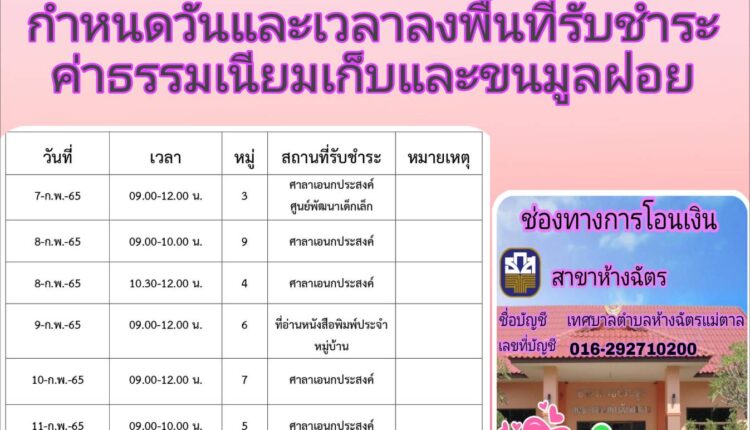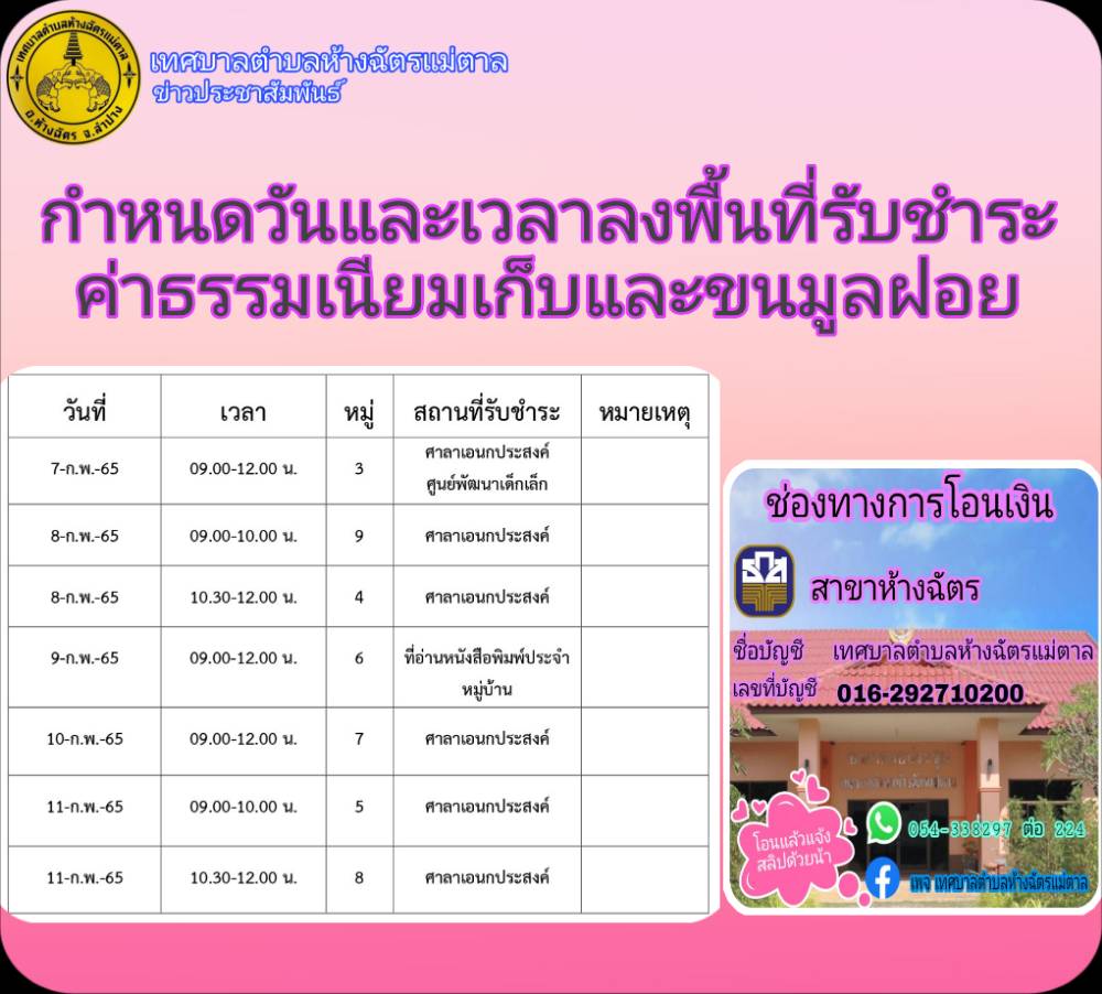 กำหนดวันและเวลาลงพื้นที่รับชำระค่าธรรมเนียมเก็บและขนมูลฝอย เทศบาลตำบลห้างฉัตรแม่ตาล