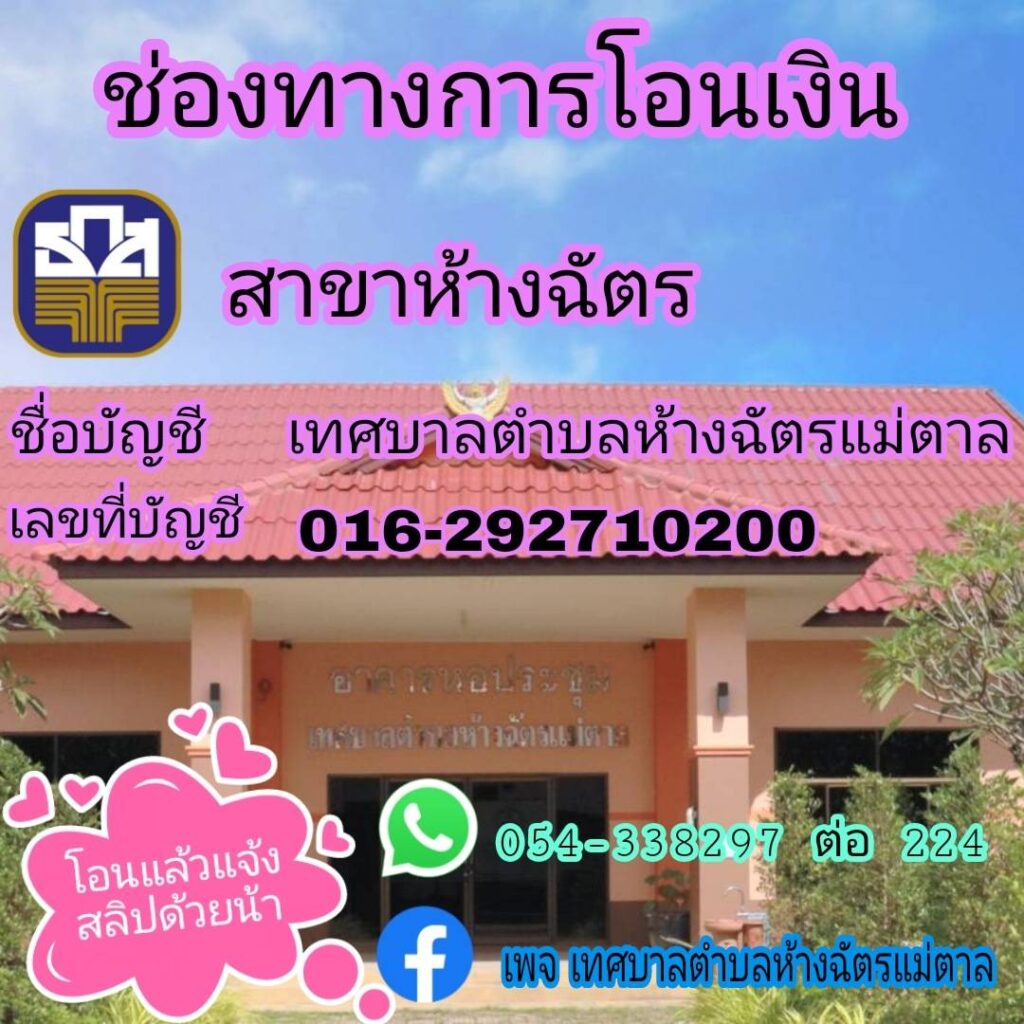 หมายเหตุ…..หากไม่สะดวกเดินทางมาชำระที่เทศบาลตำบลห้างฉัตรแม่ตาล ชำระได้ด้วยช่องทางการโอนเอาบัญชีของทางเทศบาลตำบลห้างฉัตรแม่ตาลได้ ตามนี้
