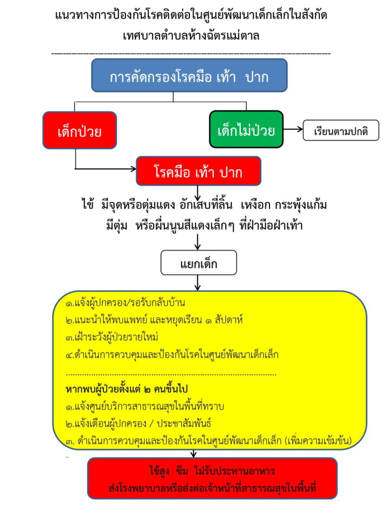 แนวทางการป้องกันโรคติดต่อในศูนย์พัฒนาเด็กเล็ก โรคติดต่อที่สำคัญ ได้แก่ โรคมือ เท้า ปาก เนื่องจากเด็กเล็กเป็นช่วงอายุที่ร่างกายมีภูมิต้านทานโรคต่างๆต่ำทำให้เด็ก เจ็บป่วยได้ง่าย การเจ็บป่วยในวัยนี้อาจส่งผลต่อพัฒนาการและสุขภาพโดยรวมของเด็ก หากไม่ได้รับ การดูแลรักษาอย่างเหมาะสมตั้งแต่เริ่มป่วยอาจทำให้เกิดภาวะแทรกซ้อนหรือมีอาการรุนแรงถึงเสียชีวิตได้นอกจากนี้ยังส่งผลกระทบต่อผู้ปกครองที่ต้องหยุดงานเพื่อดูแลเด็กทำให้ขาดรายได้และเสียค่าใช้จ่าย ในการรักษาพยาบาลการป้องกันควบคุมโรคที่มีประสิทธิภาพ จึงเป็นเครื่องมือที่สำคัญในการลด และแก้ไขปัญหาการเจ็บป่วยด้วยโรคติดต่อที่พบได้บ่อยในศูนย์พัฒนาเด็กเล็ก เทศบาลตำบลห้างฉัตรแม่ตาล เล็งเห็นความสำคัญของผลกระทบจากปัญหาดังกล่าว จึงได้กำหนดแนวทางดำเนินการป้องกันควบคุมโรคติดต่อที่พบบ่อยในศูนย์พัฒนาเด็กเล็ก 0 Share FacebookTwitterGoogle+ReddItWhatsAppPinterestอีเมล์