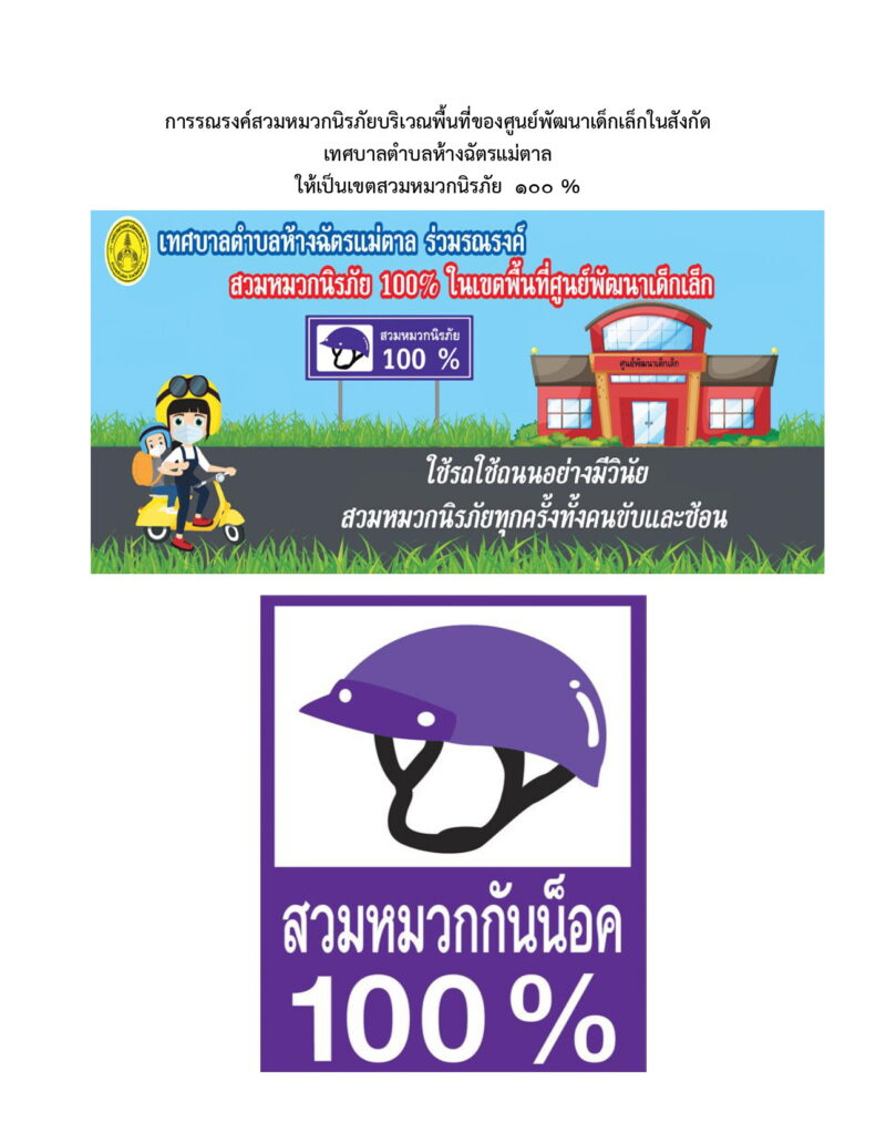 มาตรการส่งเสริมการสวมหมวกนิรภัย 100 % ของเด็กปฐมวัยในศูนย์พัฒนาเด็กเล็กในสังกัดสังกัดเทศบาลตำบลห้างฉัตรแม่ตาล เพื่อส่งเสริมให้เด็กปฐมวัยเป็นผู้มีวินัยจราจร และส่งเสริมความปลอดภัยในการสวมหมวกนิรภัยของเด็กปฐมวัย และผู้ปกครองในศูนย์พัฒนาเด็กเล็ก ให้เล็งความสำคัญกับความปลอดภัยในการเดินทางด้วยรถจักรยานยนต์