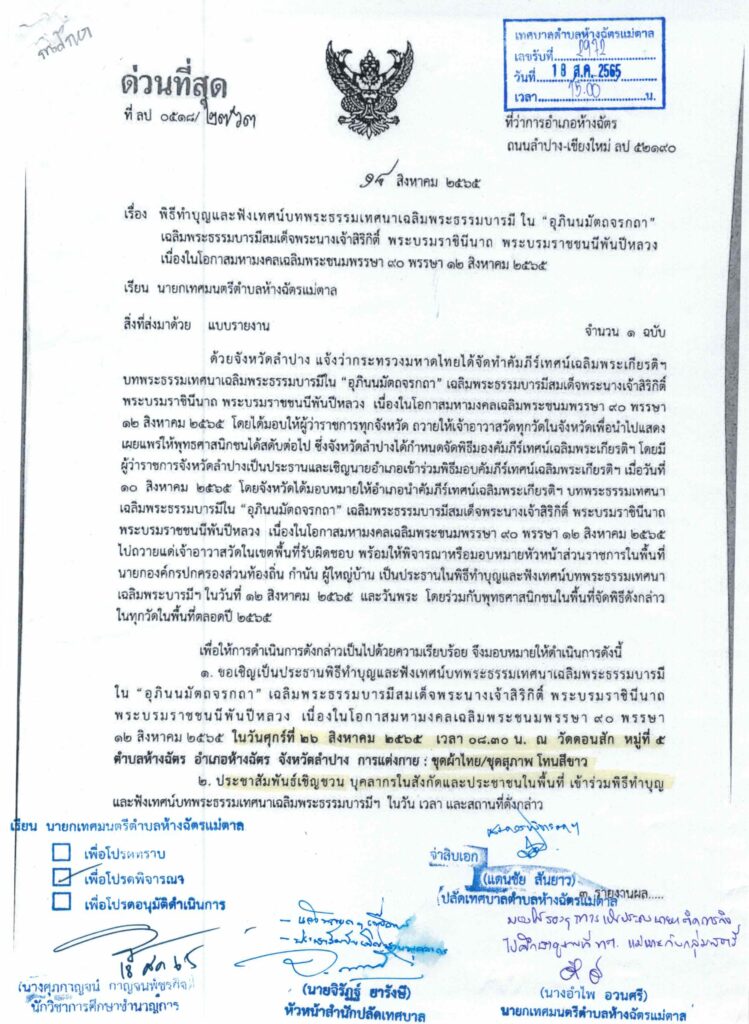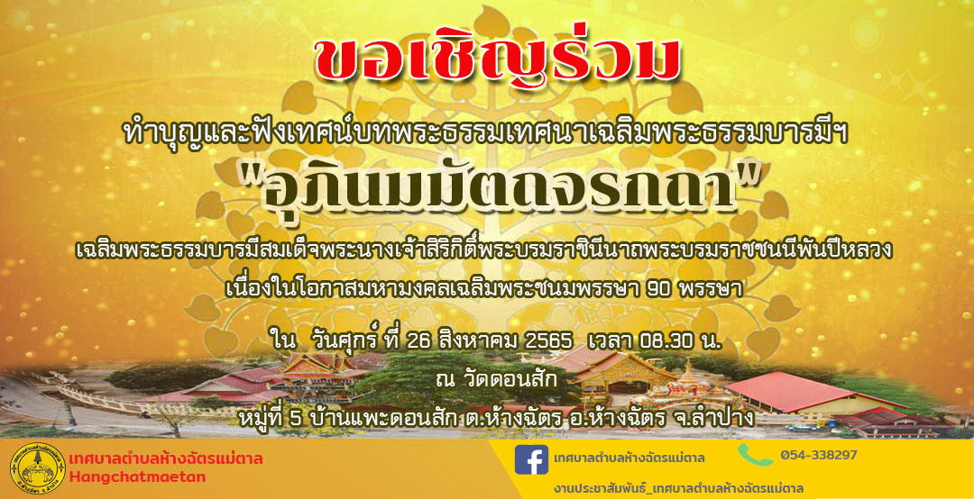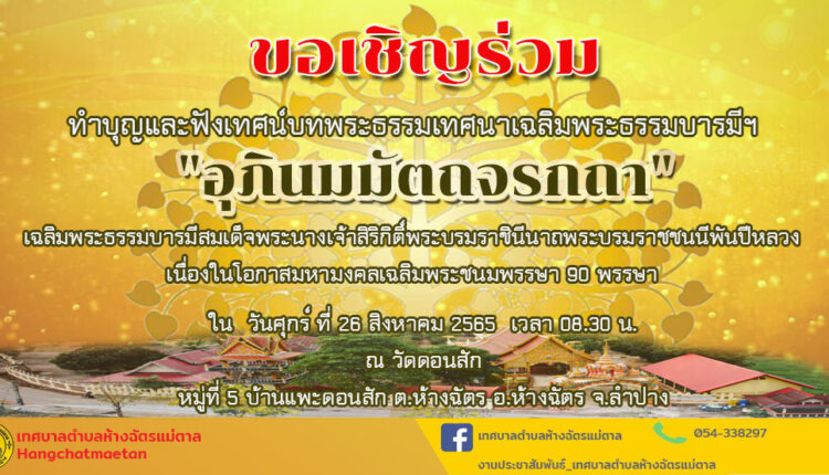 ประชาสัมพันธ์ เรื่อง พิธีทำบุญและฟังเทศน์บทพระธรรมเทศนาเฉลิมพระธรรมบารมี ใน”อุถินนมัตถจรกถา”เฉลิมพระธรรมบารมีสมเด็จพระนางเจ้าสิริกิต์ พระบรมราชินีนาถ พระบรมราชชนนีพันปีหลวง เนื่องในโอกาสมหามงคลเฉลิมพระชนมพรรษา 90 พรรษา 12 สิงหาคม 2565 0 Share FacebookTwitterGoogle+ReddItWhatsAppPinterestอีเมล์
