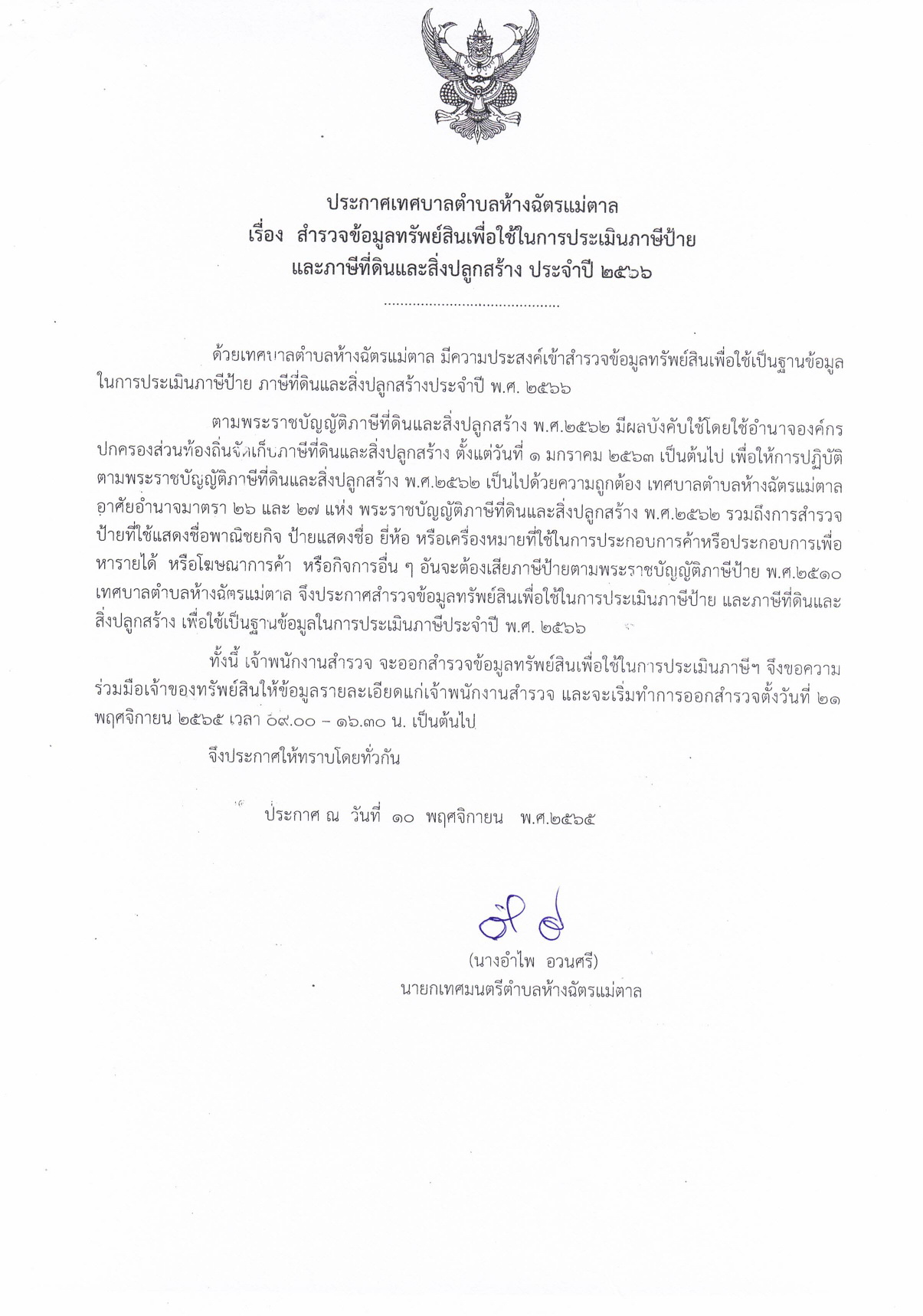 • ประการเทศบาลตำบลห้างฉัตรแม่ตาล เรื่อง สำรวจข้อมูลทรัพย์สินเพื่อใช้ในการประเมินภาษีป้ายและภาษีที่ดินและสิางปลูกสร้าง ประจำปี 2566