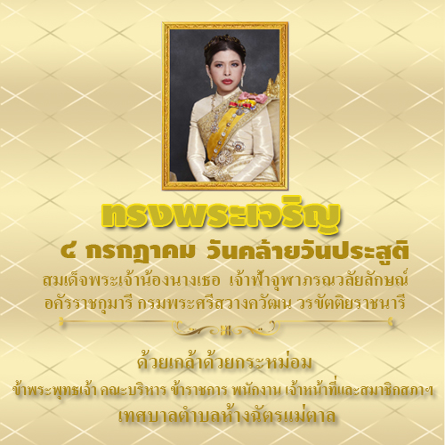 ข่าวประชาสัมพันธ์เทศบาลตำบลห้างฉัตรแม่ตาล ขอเชิญชวนประชาชนร่วมลงนามถวายพระพร สมเด็จพระเจ้าน้องนางเธอ เจ้าฟ้าจุฬาภรณวลัยลักษณ์ อัครราชกุมารี กรมพระศรีสวางควัฒน วรขัตติยราชนารี เนื่องในโอกาสวันคล้ายวันประสูติ วันที่ ๔ กรกฎาคม ๒๕๖๖ ผ่านระบบออนไลน์