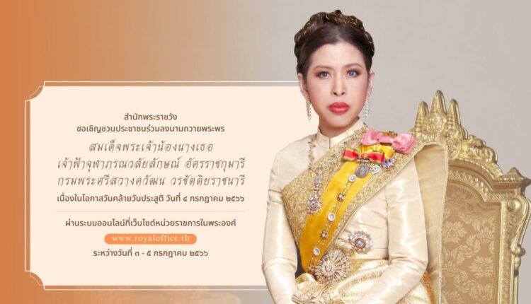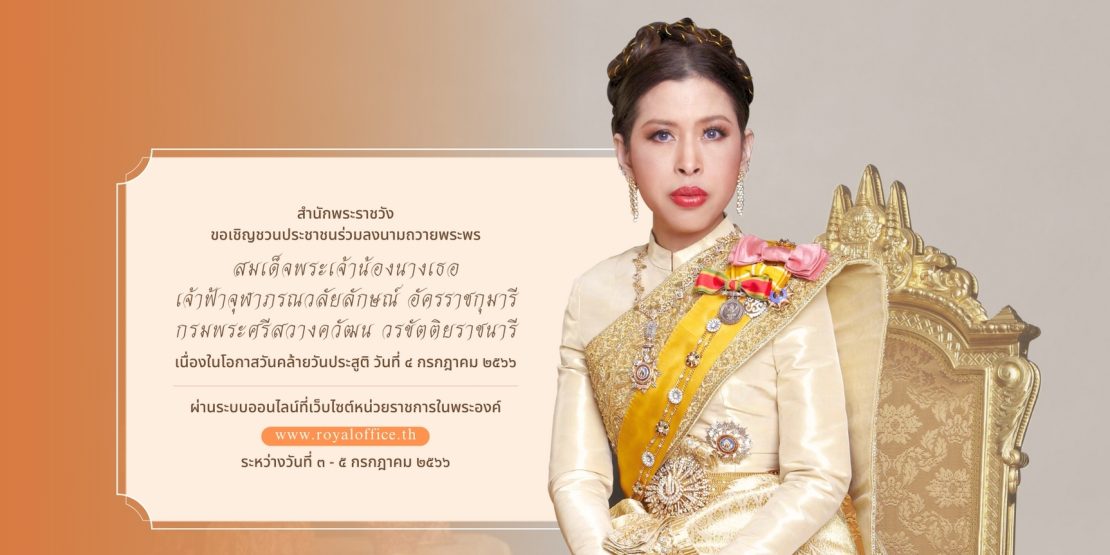สำนักพระราชวัง ขอเชิญชวนประชาชนร่วมลงนามถวายพระพร สมเด็จพระเจ้าน้องนางเธอ เจ้าฟ้าจุฬาภรณวลัยลักษณ์ อัครราชกุมารี กรมพระศรีสวางควัฒน วรขัตติยราชนารี เนื่องในโอกาสวันคล้ายวันประสูติ วันที่ ๔ กรกฎาคม ๒๕๖๖ ผ่านระบบออนไลน์ ที่เว็บไซต์หน่วยราชการในพระองค์ https://wellwishes.royaloffice.th ระหว่างวันที่ ๓ – ๕ กรกฎาคม ๒๕๖๖