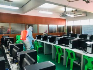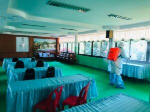 เทศบาลตำบลห้างฉัตรแม่ตาล นำเจ้าหน้าที่ฉีดพ่นยาฆ่าเชื้อโควิด-19