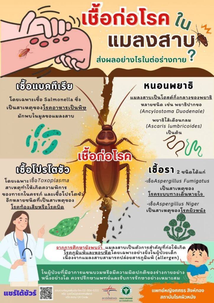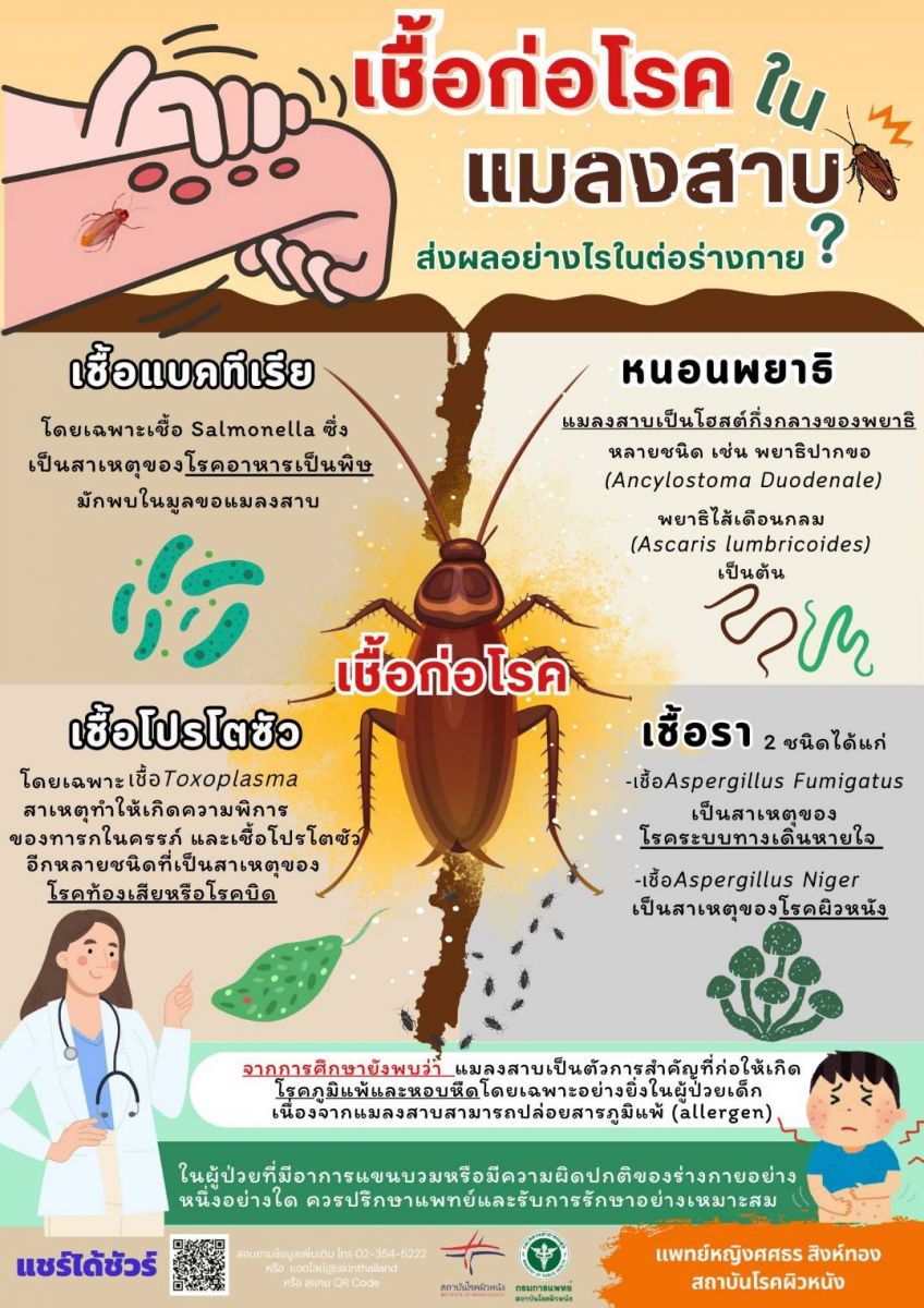 ในตัวของแมลงสาบนั้นมีเชื้อก่อโรคซึ่งเป็นสาเหตุของการเจ็บป่วยตามมา เช่น โรคอาหารเป็นพิษโรคท้องเสีย หรือโรคบิด และเป็นสาเหตุหลักที่ก่อนโรคภูมิแพ้หรือหอบหืด เป็นต้น ประชาชนควรหมั่นทำความสะอาดบ้านเรือน ปิดฝาถังขยะ เพื่อป้องกันแมลงสาบที่เป็นพาหนะเชื้อก่อโรค หากมีอาการผิดปกติควรปรึกษาแพทย์ผู้เชี่ยวชาญเพื่อรับการตรวจวินิจฉัยรักษาอย่างถูกต้องสามารถสอบถามเพิ่มเติมได้ที่ กรมการแพทย์โทร 02-354-5222
