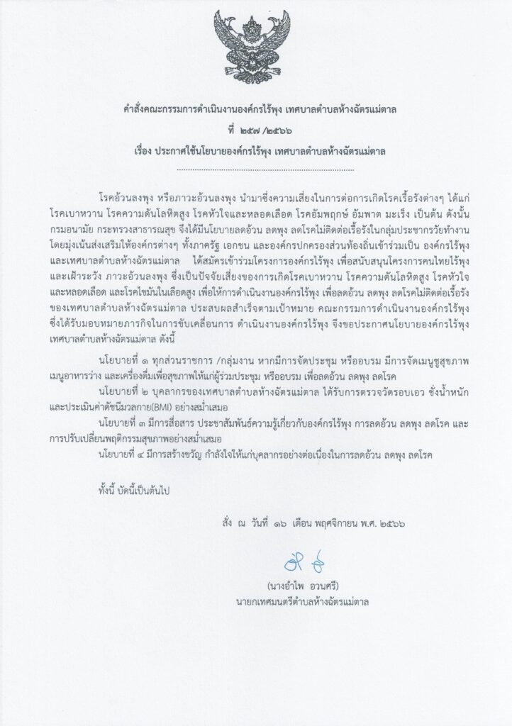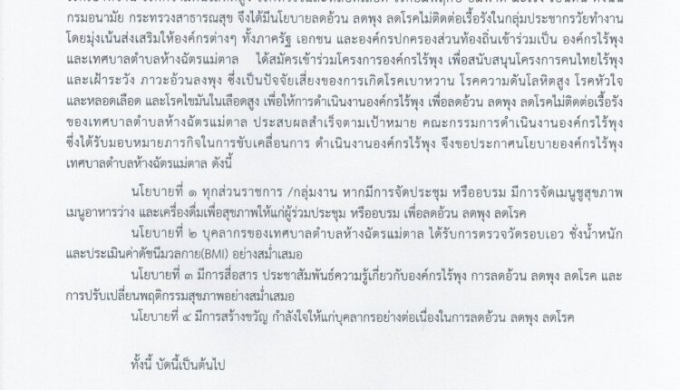 ประกาศ นโยบายองค์กรไร้พุงเทศบาลตำบลห้างฉัตรแม่ตาล