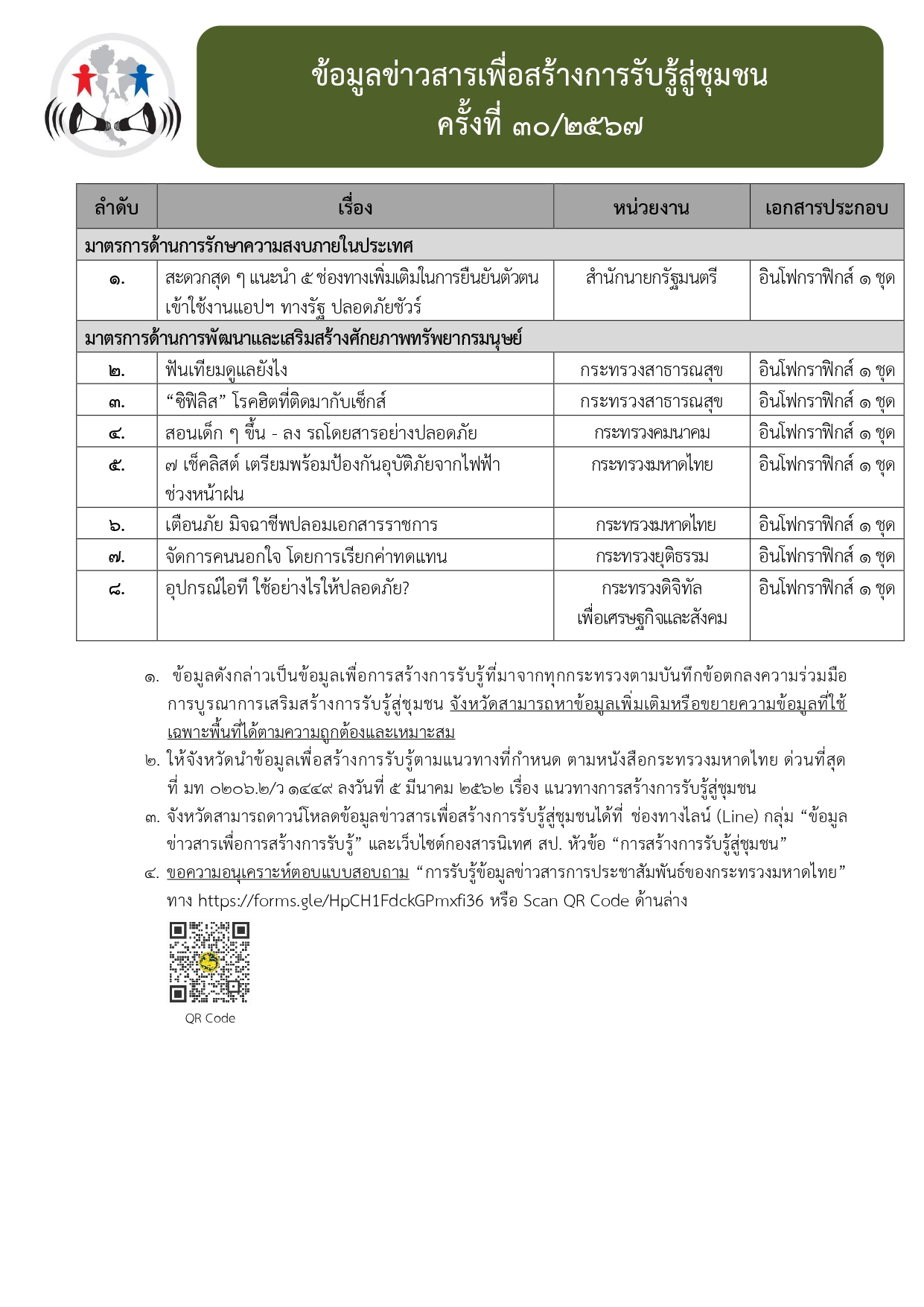 ข้อมูลข่าวสารเพื่อสร้างการรับรู้สู่ชุมชน ครั้งที่ 30/2567