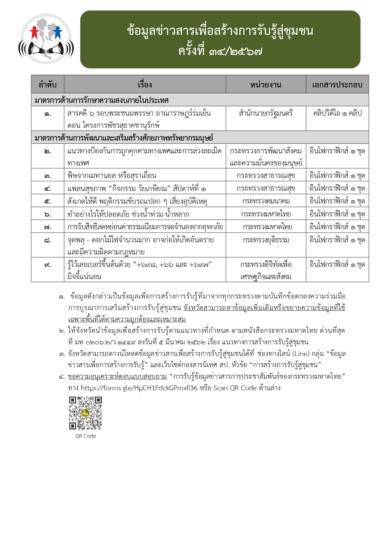 ข้อมูลข่าวสารเพื่อสร้างการรับรู้สู่ชุมชน ครั้งที่ 34/2567