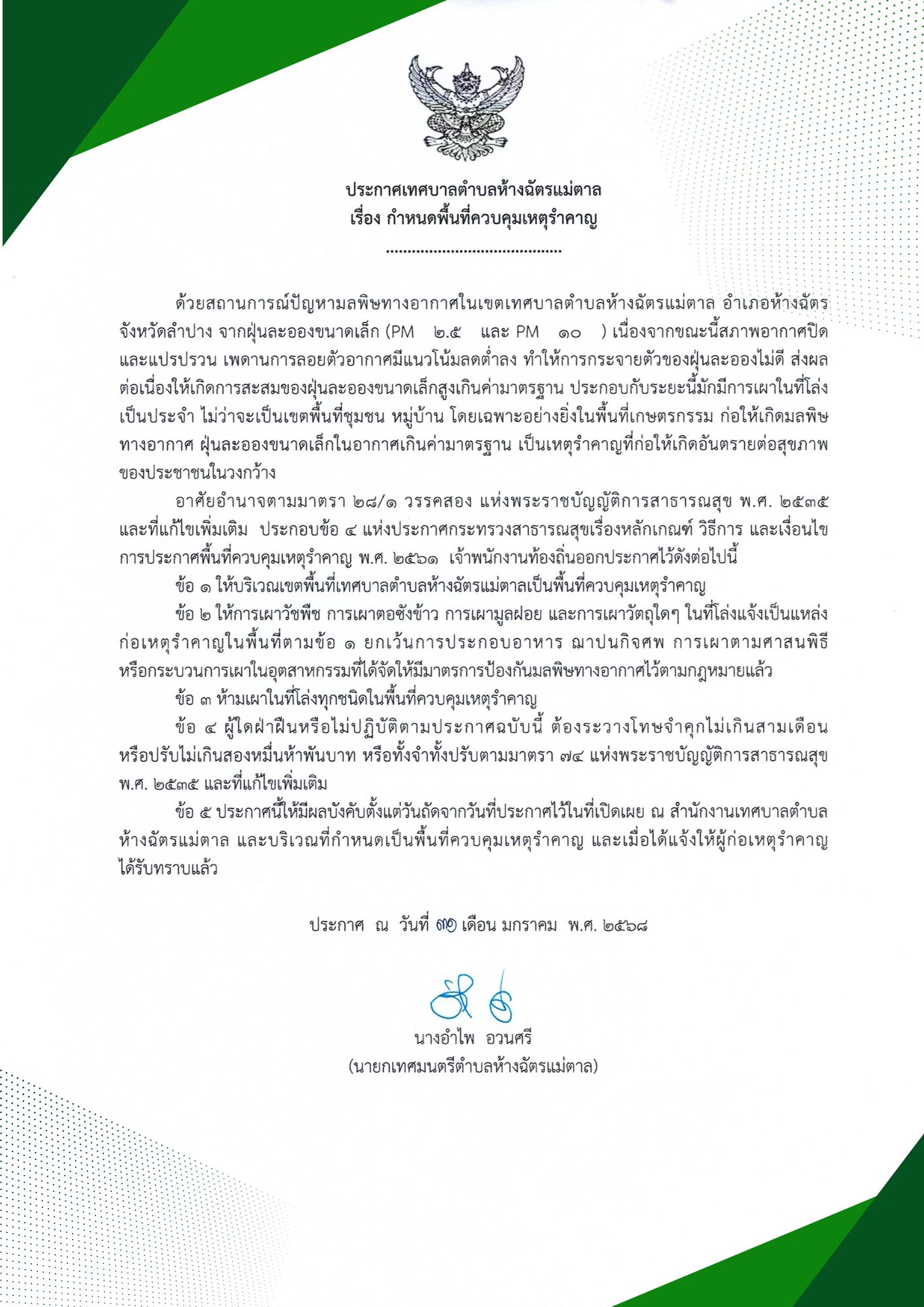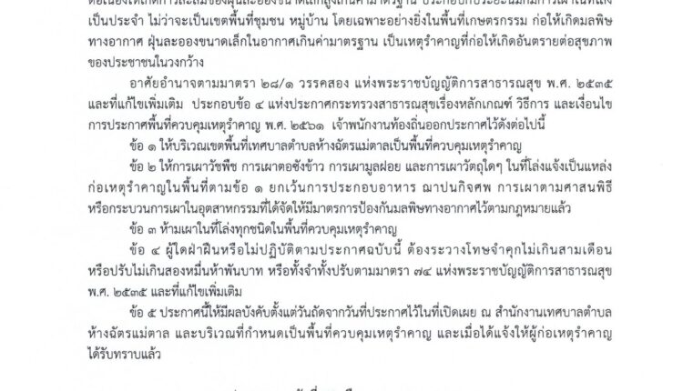ประกาศเทศบาลตำบลห้างฉัตรเเม่ตาล เรื่อง กำหนดพื้นที่ควบคุมเหตุรำคาญ