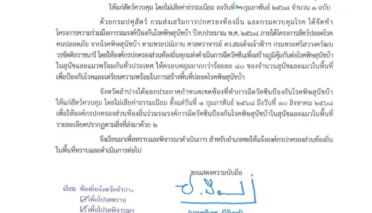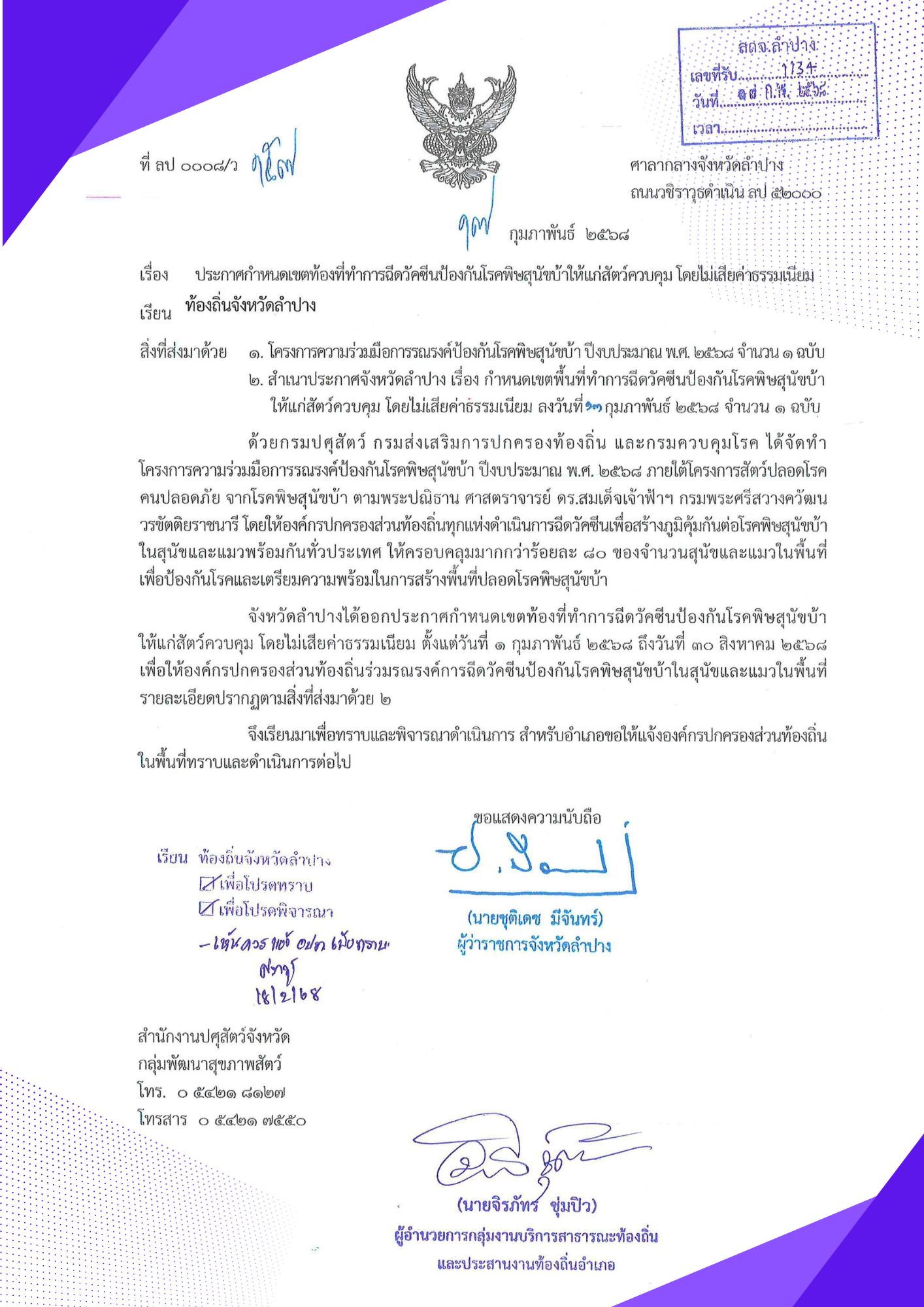 ประกาศจังหวัดลำปาง เรื่อง กำหนดเขตท้องที่ทำการฉีดวัคซีนป้องกันโรคพิษสุนัขบ้าให้แก่สัตว์ควบคุมโดยไม่เสียค่าธรรมเนียม ประจำปี 2568