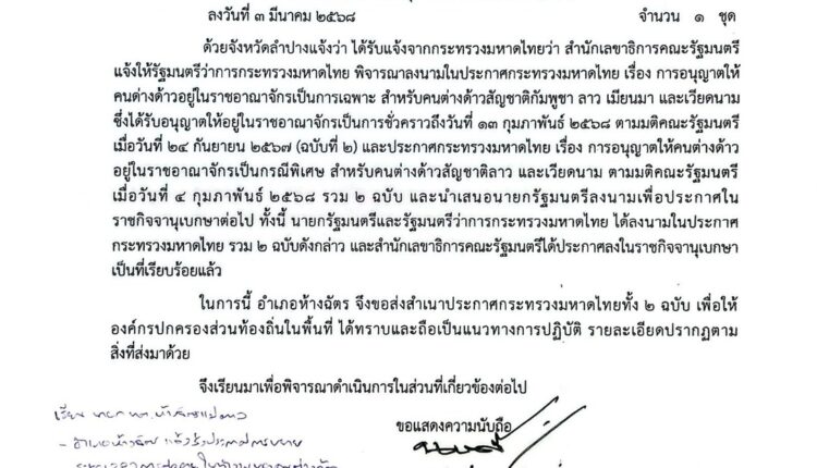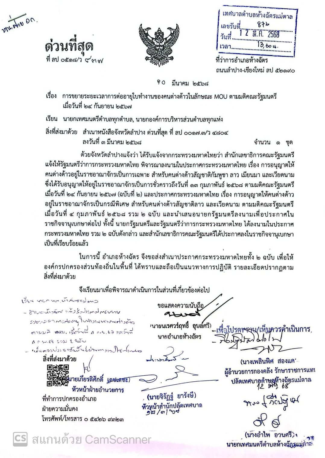 การขยายระยะเวลาการต่ออายุใบทำงานของต่างด้าวในลักษณะ MOU ตามมติคณะรัฐมนตรี เมื่อวันที่ 24 กันยายน 2567