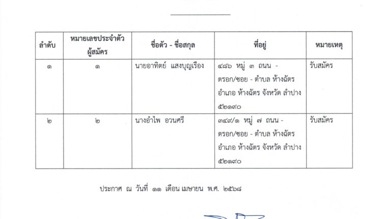 ประกาศผู้อำนวยการการเลือกตั้งประจำเทศบาลตำบลห้างฉัตรแม่ตาล อำเภอห้างฉัตร จังหวัดลำปาง เรื่อง บัญชีรายชื่อผู้สมัครรับเลือกตั้งนายกเทศมนตรีตำบลห้างฉัตรแม่ตาลที่ได้รับสมัครรับเลือกตั้งและไม่รับสมัครรับเลือกตั้ง ประกาศ ณ วันที่ 11 เมษายน 2568 สร้างสรรค์ประเทศไทย พร้อมใจไปเลือกตั้ง #ข่าวประชาสัมพันธ์ #เลือกตั้ง #เทศบาลตำบลห้างฉัตรเเม่ตาล
