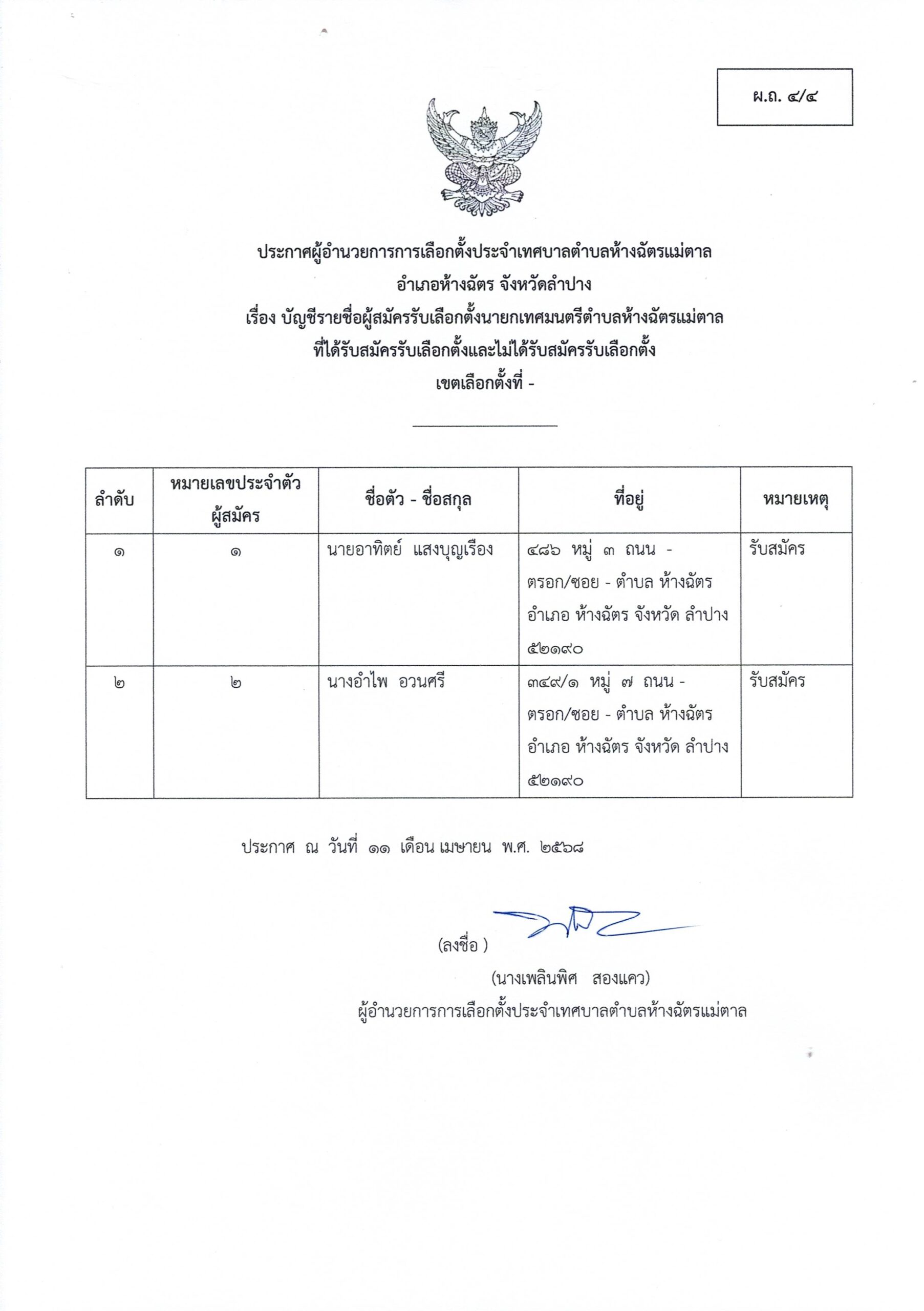 เรื่อง บัญชีรายชื่อผู้สมัครรับเลือกตั้งนายกเทศมนตรีตำบลห้างฉัตรแม่ตาลที่ได้รับสมัครรับเลือกตั้งและไม่รับสมัครรับเลือกตั้ง