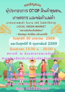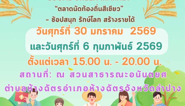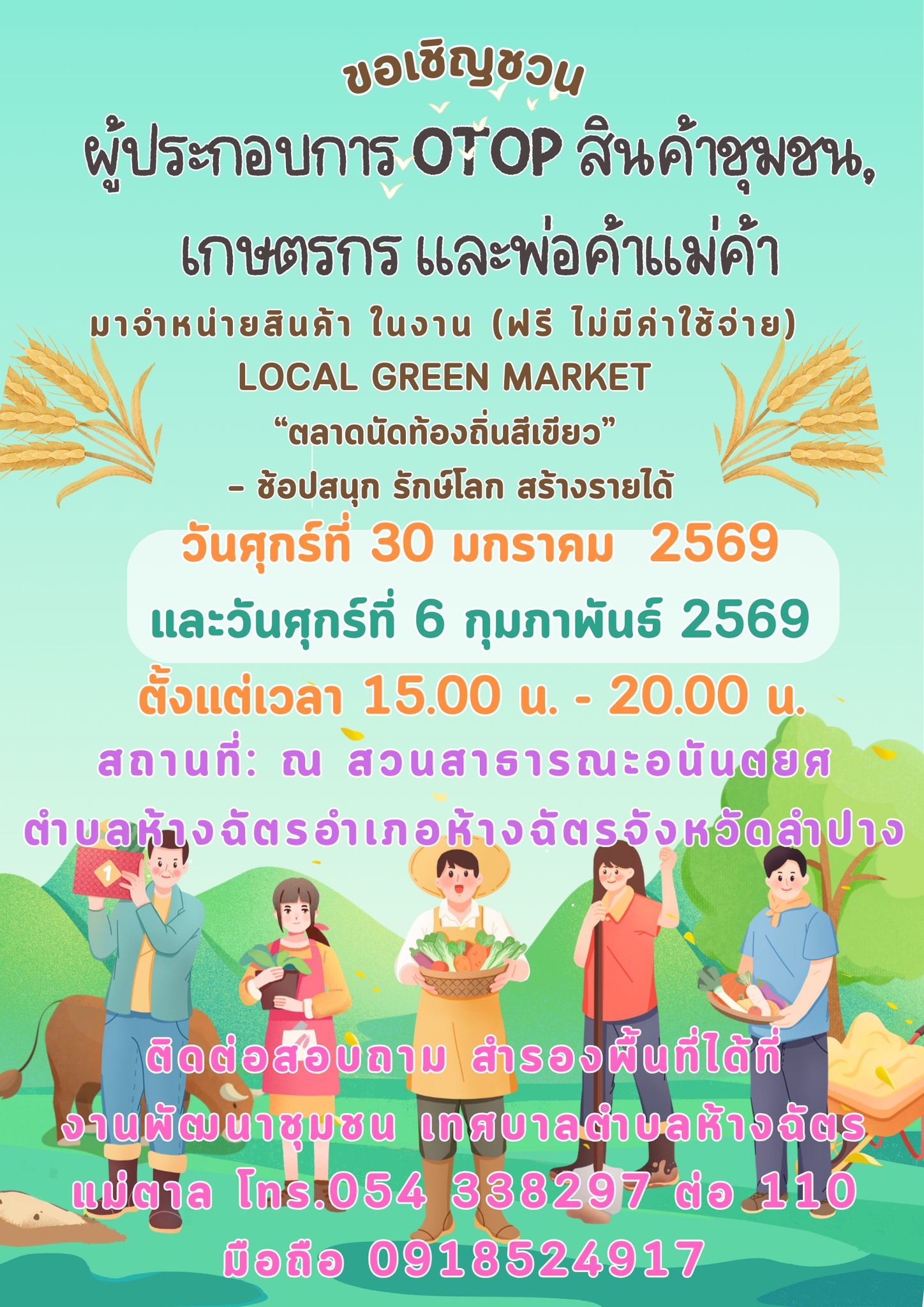 เทศบาลตำบลห้างฉัตรแม่ตาล ขอเชิญชวนผู้ประกอบการสินค้าโอทอปและผลิตภัณฑ์ชุมชน เกษตรกร พ่อค้า แม่ค้า ลงทะเบียนจำหน่ายสินค้าในงาน ตลาดนัดท้องถิ่นสีเขียว : LOCAL GREEN MARKET ” ช้อปสนุก รักษ์โลก สร้างรายได้” ในศุกร์ที่ 30 มกราคม 2569 และวันศุกร์ที่ 6 กุมภาพันธ์ 2569 ณ สวนสาธารณะอนันตยศ ตำบลห้างฉัตร อำเภอห้างฉัตร จังหวัดลำปาง