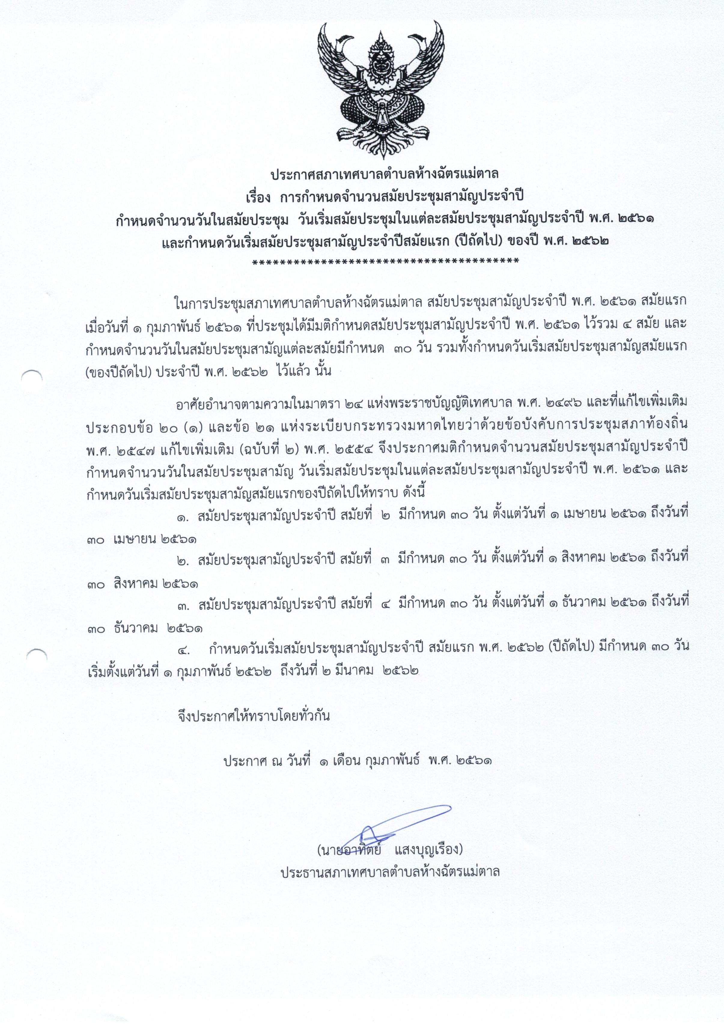 ประกาศกำหนดสมัยประชุมสามัญประจำปี 2561ฯ และปีถัดไป 2562