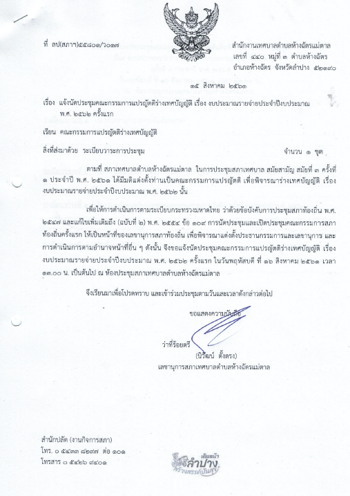 • เรื่อง แจ้งนัดประชุมสภา สภาเทศบาลตำบลห้างฉัตรแม่ตาล สมัยประชุมสามัญ สมัยที่ 3 ครั้งที่ 1 ประจำปี พ.ศ.2561
