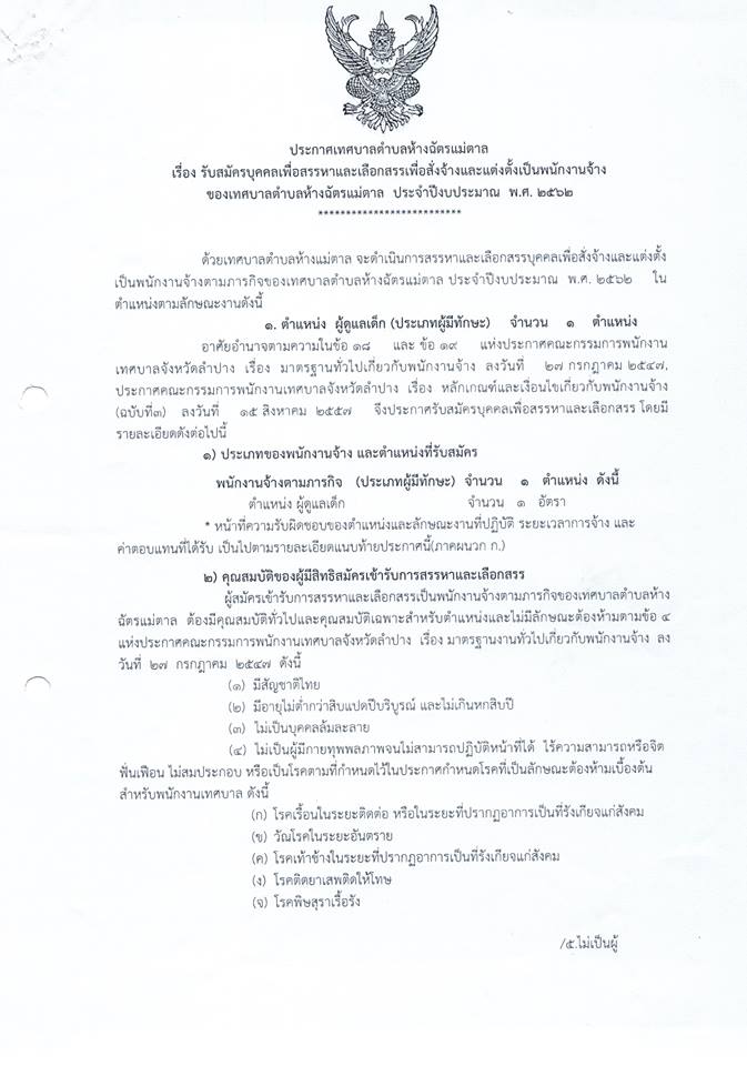 ประกาศเทศบาลตำบลห้างฉัตรแม่ตาล เรื่อง รับสมัครบุคคลเพื่อการสรรหาและเลือกสรรเพื่อสั่งจ้างและแต่งตั้งเป็นพนักงานจ้าง ของเทศบาล ตำแหน่ง ผู้ดูแลเด็ก จำนวน 1 อัตรา