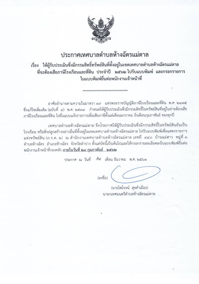 ประกาศเทศบาลตำบลห้างฉัตรแม่ตาล เรื่อง ให้ผู้รับประเมินซึ่งมีกรรมสิทธิ์ทรัพย์สินที่ตั้งอยู่ในเขตเทศบาลตำบลห้างฉัตรแม่ตาล ที่จะต้องเสียภาษีโรงเรือนและที่ดิน ประจำปี 2562 ไปรับแบบพิมพ์ และกรอกรายการในแบบพิมพ์ยื่นต่อพนักงานเจ้าหน้าที่ 0 Share FacebookTwitterGoogle+ReddItWhatsAppPinterestอีเมล์