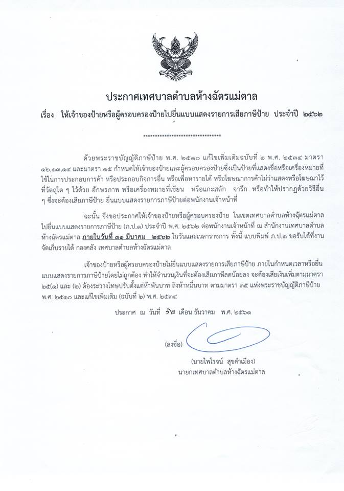 ประกาศเทศบาลตำบลห้างฉัตรแม่ตาล เรื่อง ให้เจ้าของป้ายหรือผู้ครอบครองป้ายไปยื่นแบบแสดงรายการเสียภาษีป้าย ประจำปี 2562 0 Share FacebookTwitterGoogle+ReddItWhatsAppPinterestอีเมล์