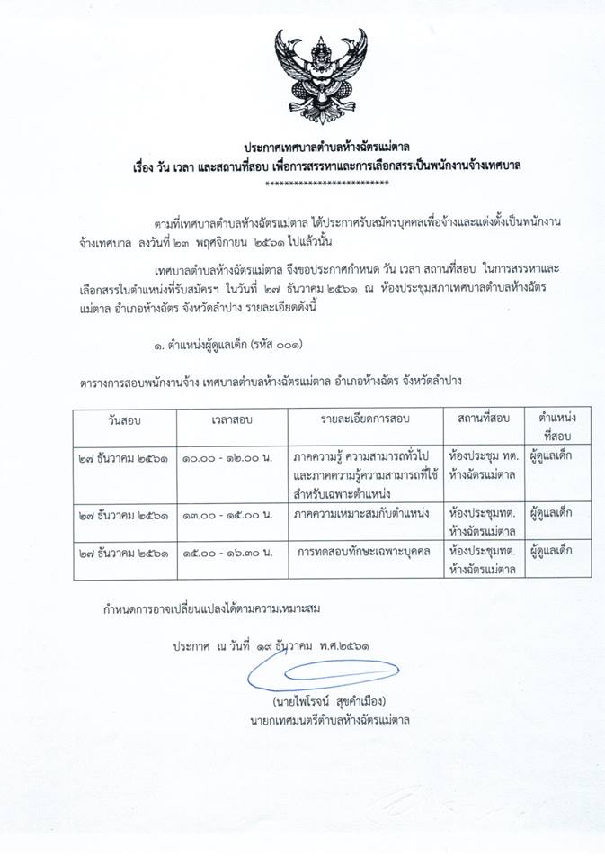 ประกาศเทศบาลตำบลห้างฉัตรแม่ตาล เรื่อง วัน เวลา และสถานที่สอบ เพื่อการสรรหาและการเลือกสรรเป็นพนักงานจ้างเทศบาล48402978_1963392817291069_6827483560811692032_n