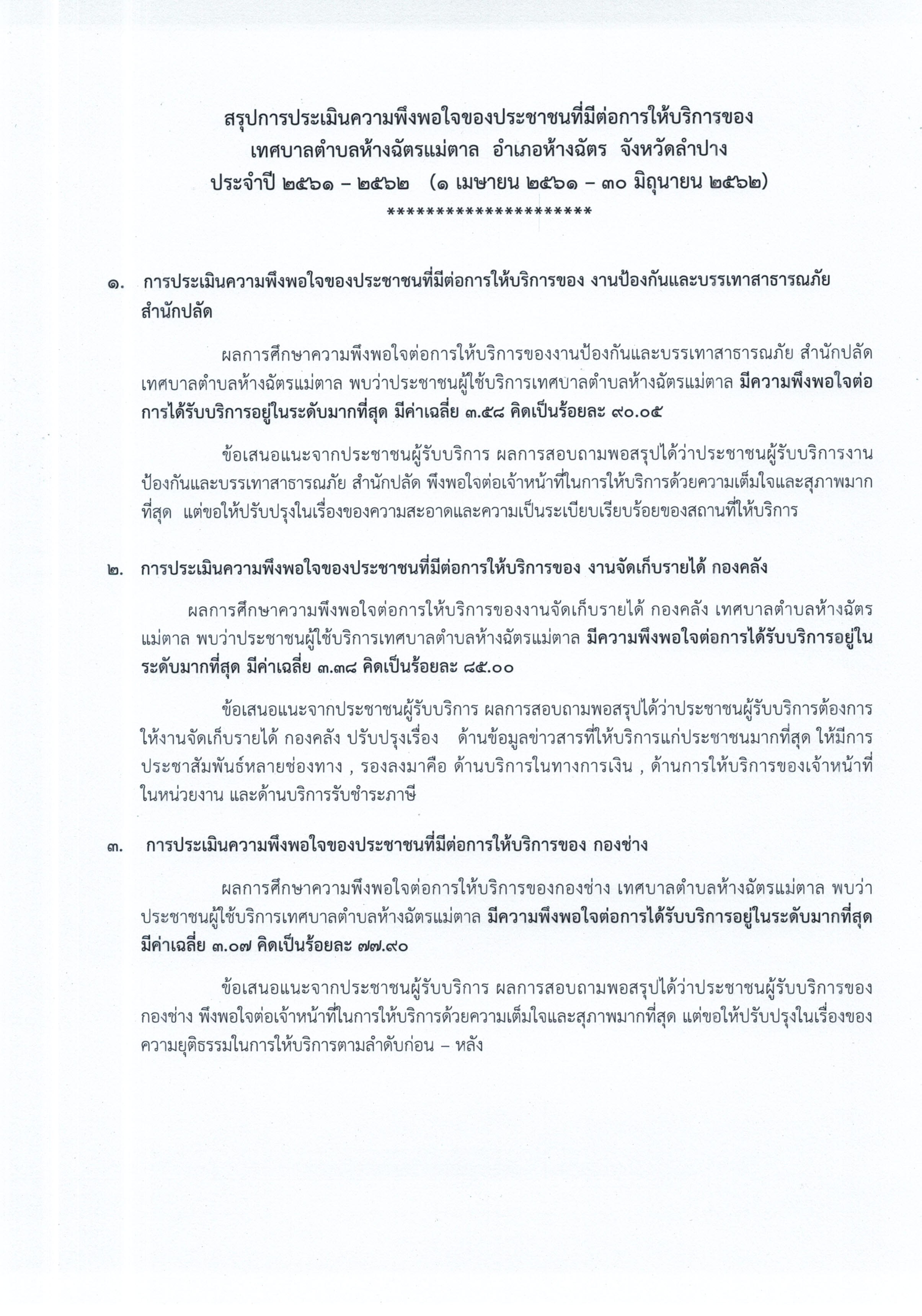 การประเมินความพึงพอใจของประชาชนที่มีต่อการให้บริการของเทศบาลตำบลห้างฉัตรแม่ตาล ประจำปี 2561-2562 0 Share FacebookTwitterGoogle+ReddItWhatsAppPinterestอีเมล์