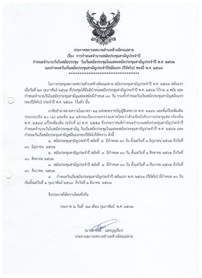 ประกาศสภาเทศบาลตำบลห้างฉัตรแม่ตาล เรื่อง การกำหนดจำนวนสมัยประชุมสามัญประจำปี กำหนดจำนวนวันในสมัยประชุม วันเริ่มสมัยประชุมในแต่ละสมัยประชุมสามัญประจำปี 2562 และกำหนดวันเริ่่มสมัยประชุมสามัญประจำปีสมัยแแรก (ปีถัดไป) ของปี 2563