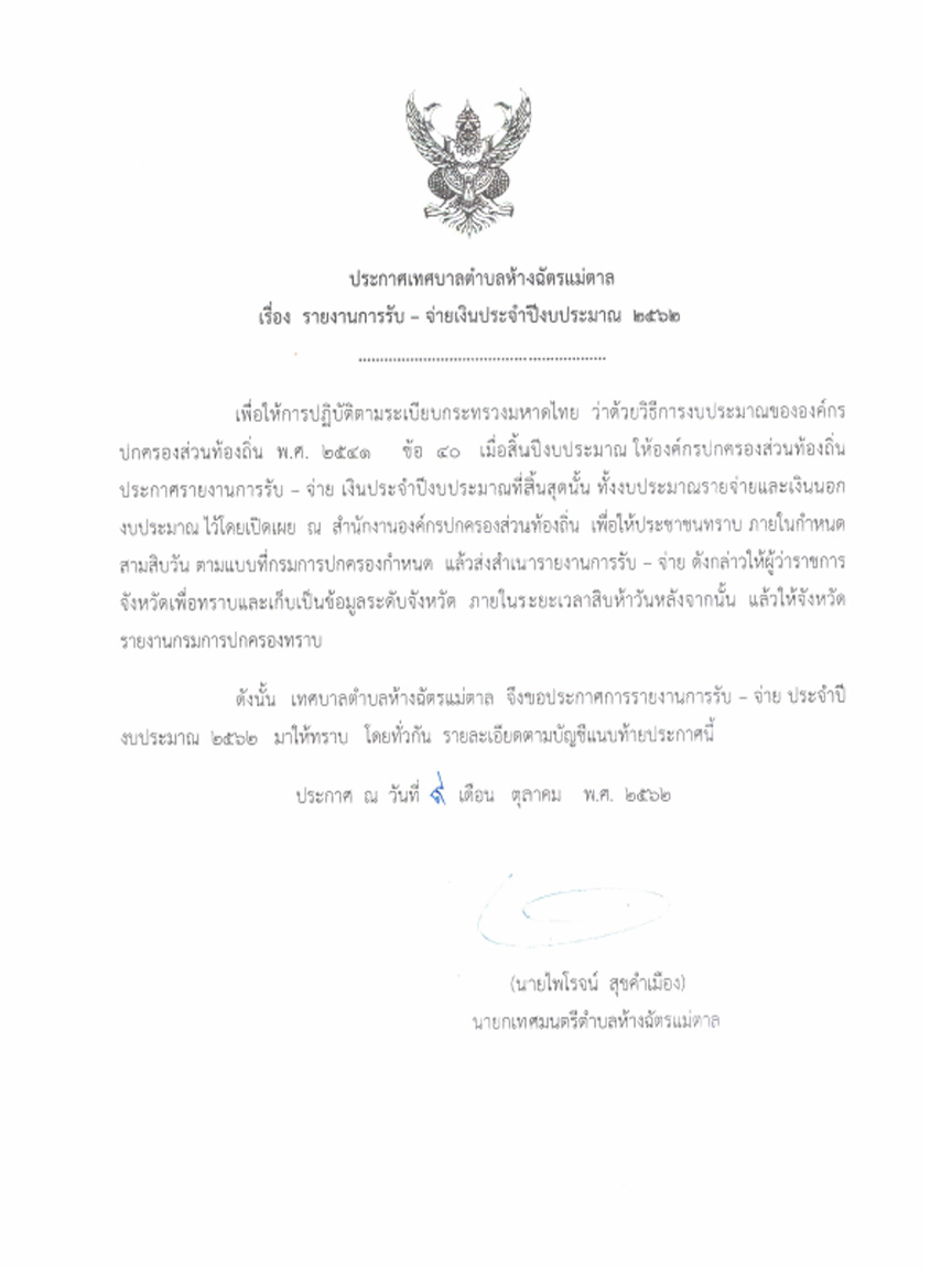 ประกาศเทศบาลตำบลห้างฉัตรแม่ตาล เรื่อง รายงานการรับ – จ่ายประจำปีงบประมาณ 2562 CCF15102562 0 Share FacebookTwitterGoogle+ReddItWhatsAppPinterestอีเมล์