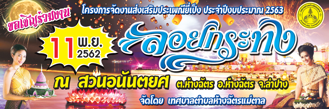 ขอเชิญร่วมงาน โครงการจัดงานส่งเสริมประเพณียี่เป็ง “ลอยกระทง” ประจำปีงบประมาณ 2563 วันจันทร์ ที่ 11 พฤศจิกายน 2562 ณ สวนอนันตยศ ต.ห้างฉัตร อ.ห้างฉัตร จ.ลำปาง อย่าลืมมาร่วมงานกันนะคะ 0 Share FacebookTwitterGoogle+ReddItWhatsAppPinterestอีเมล์
