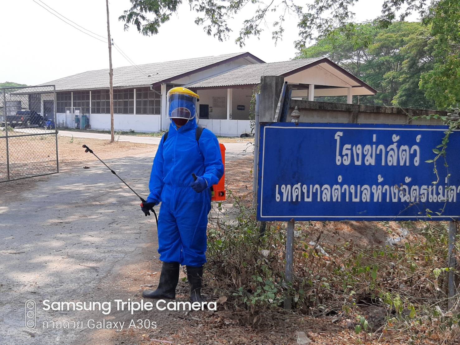 ออกพ่นน้ำยาฆ่าเชื้อ เพื่อเป็นการป้องกันการแพร่ระบาดของไวรัสโควิด – 19 เบื้องต้น ณ โรงฆ่าสัตว์เทศบาลตำบลห้างฉัตรแม่ตาล ตั้งอยู่ ณ บ้านปันง้าว หมู่ 7