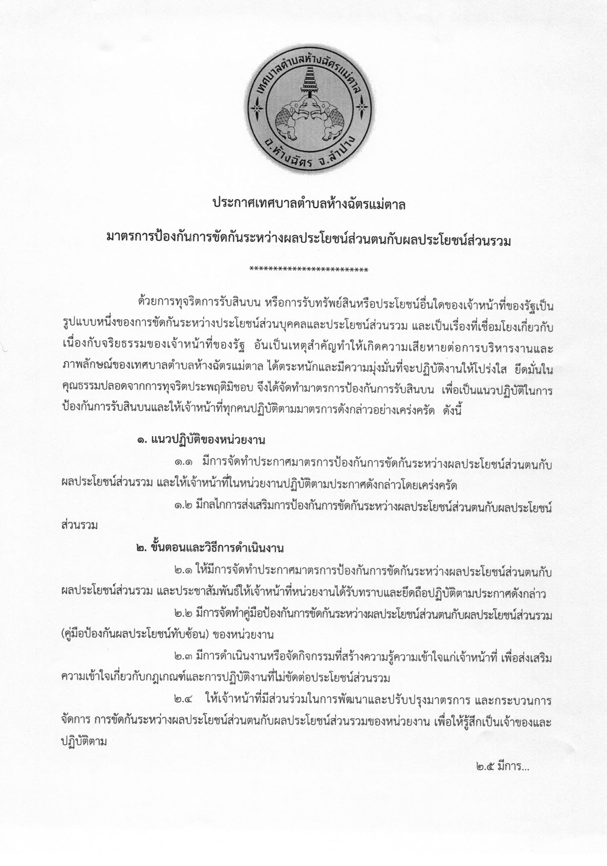 มาตรการป้องกันการขัดกันระหว่างผลประโยชน์ส่วนตนกับผลประโยชน์ส่วนรวม ของเทศบาลตำบลห้างฉัตรแม่ตาล 0 Share FacebookTwitterGoogle+ReddItWhatsAppPinterestอีเมล์