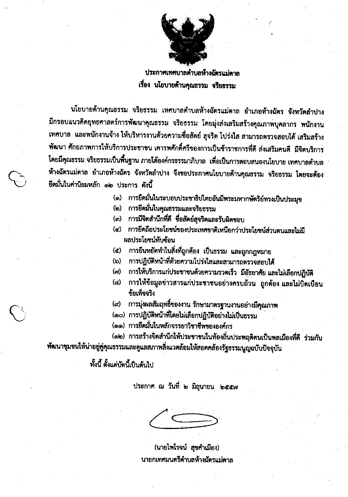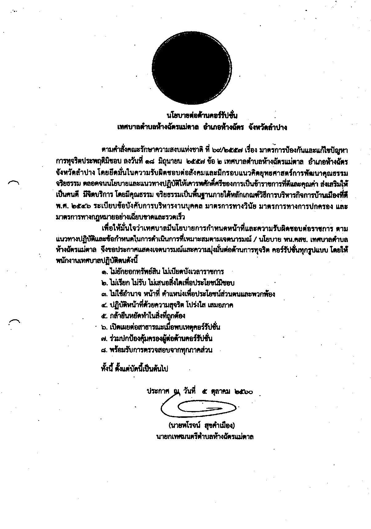 นโยบายต่อคอร์รัปชั่น ของเทศบาลตำบลห้างฉัตรแม่ตาล 0 Share FacebookTwitterGoogle+ReddItWhatsAppPinterestอีเมล์