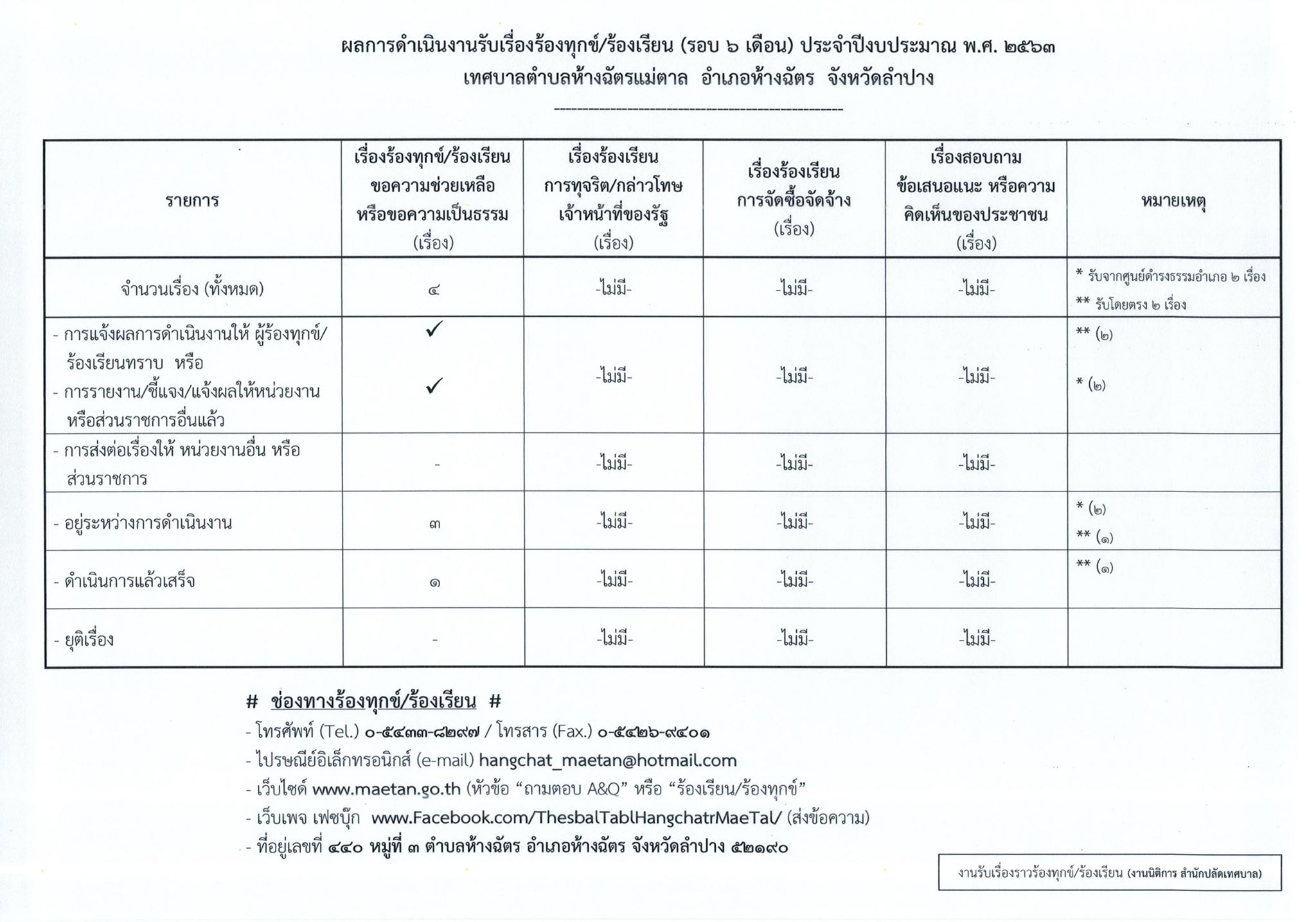ผลการดำเนินงานรับเรื่องร้องทุกข์/ร้องเรียน(รอบ 6 เดือน) ประจำปีงบประมาณ 2563