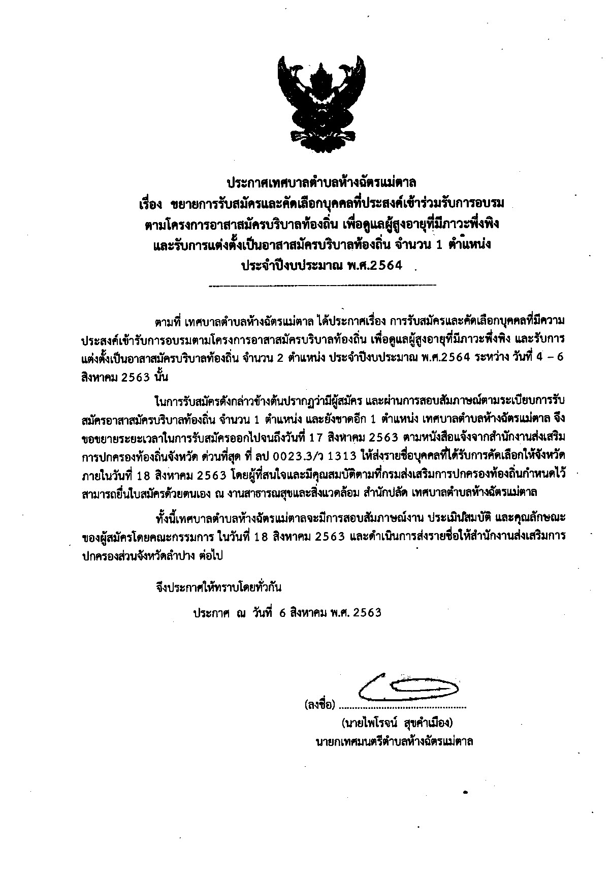 ประกาศเทศบาล เรื่อง ขยายการรับสมัครและคัดเลือกบุคคลที่ประสงค์เข้ารับการอบรม ตามโครงการอาสาสมัครท้องถิ่นฯ จำนวน 1 ตำแหน่ง ปีงบประมาณ 2564