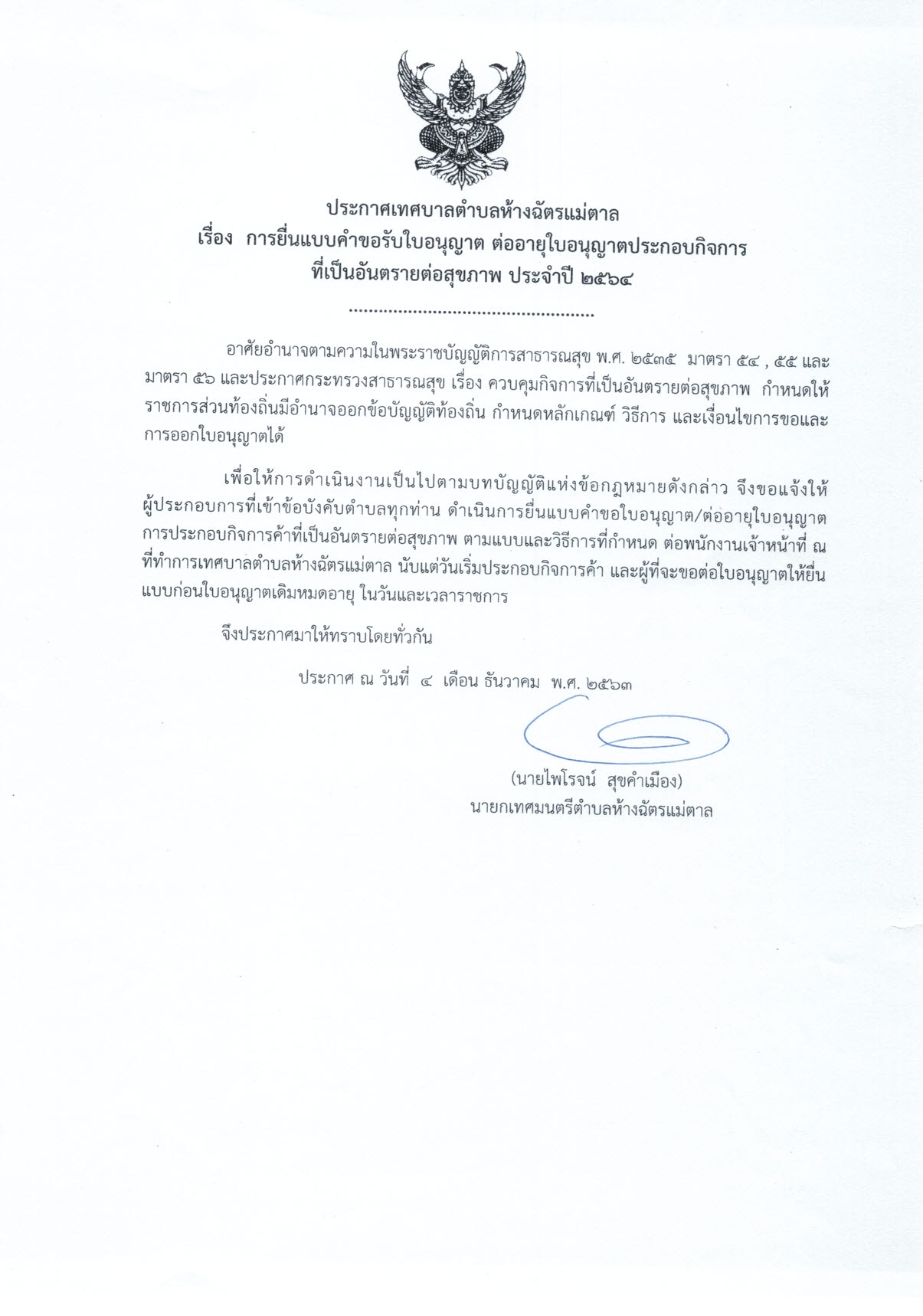 ประกาศเทศบาลตำบลห้างฉัตรแม่ตาล เรื่อง การยื่นแบบคำขอรับใบอนุญาต ต่ออายุใบอนุญาตประกอบกิจการที่เป็นอันตรายต่อสุขภาพ ประจำปี 2564 0 Share FacebookTwitterGoogle+ReddItWhatsAppPinterestอีเมล์