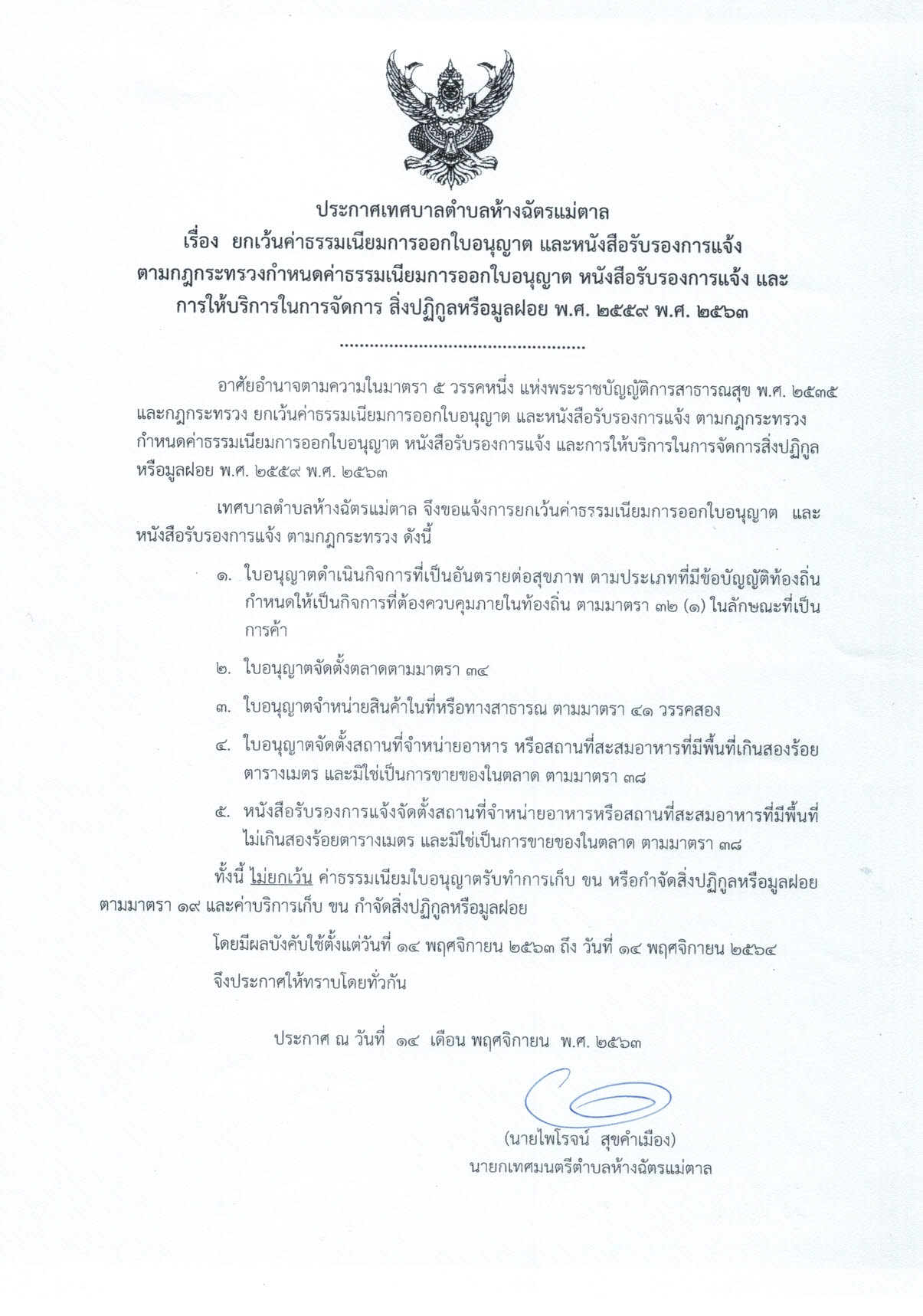 ปก. เทศบาลตำบลห้างฉัตรแม่ตาล เรื่อง การยกเว้นค่าธรรมเนียมการออกใบอนุญาตและหนังสือรับรองการแจ้งตามกฎกระทรวงฯ