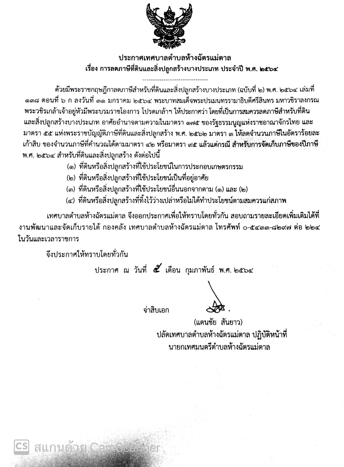 • ประกาศ เรื่อง การลดภาษีที่ดินและสิ่งปลูกสร้างบางประเภท ประจำปี พ.ศ.2564
