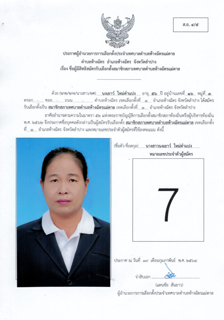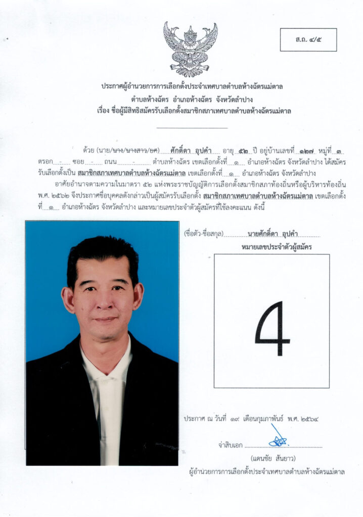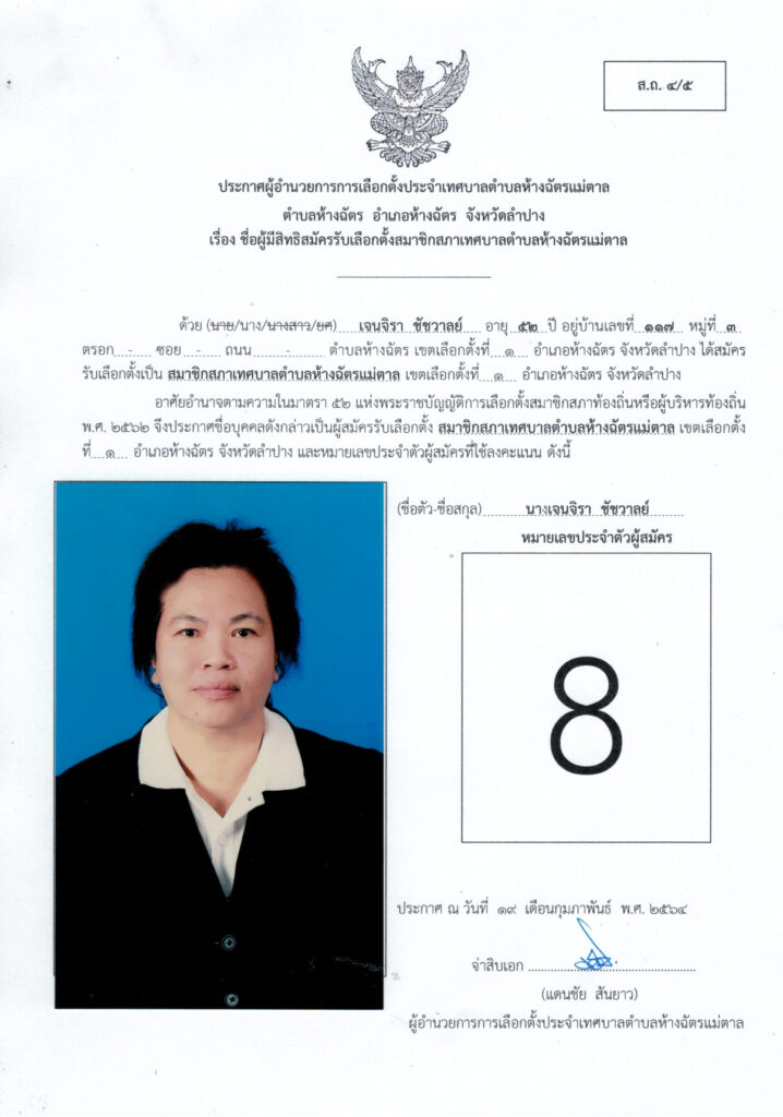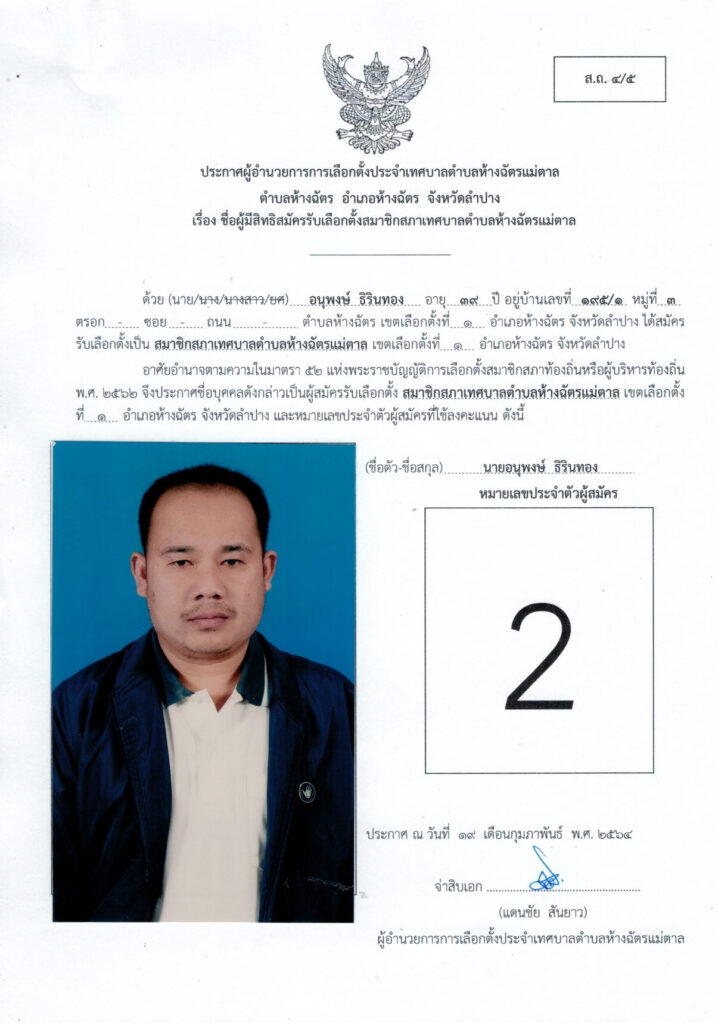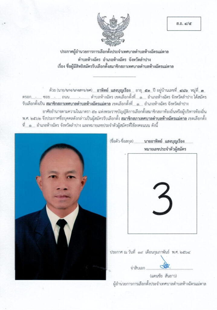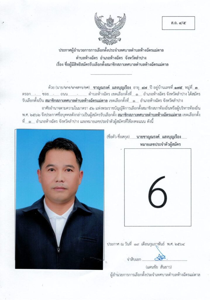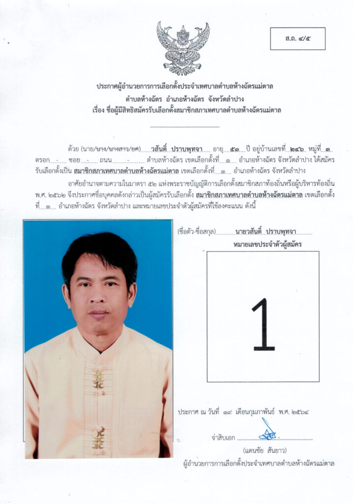 📣 ประกาศผู้อำนวยการการเลือกตั้งประจำเทศบาลตำบลห้างฉัตรแม่ตาล อำเภอห้างฉัตร จังหวัดลำปาง เรื่อง บัญชีรายชื่อผู้รับสมัครรับเลือกตั้งสมาชิกสภาเทศบาลตำบลห้างฉัตรแม่ตาล เขตเลือกตั้งที่ 1 0 Share FacebookTwitterGoogle+ReddItWhatsAppPinterestอีเมล์