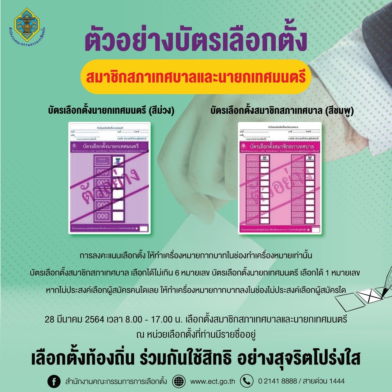 ตัวอย่างบัตรเลือกตั้งสมาชิกสภาเทศบาลและนายกเทศมนตรี ในวันอาทิตย์ที่ 28 มีนาคม 2564 ผู้มีสิทธิเลือกตั้งจะได้รับบัตรเลือกตั้ง จำนวน 2 ใบ ในการออกเสียงลงคะแนน คือ