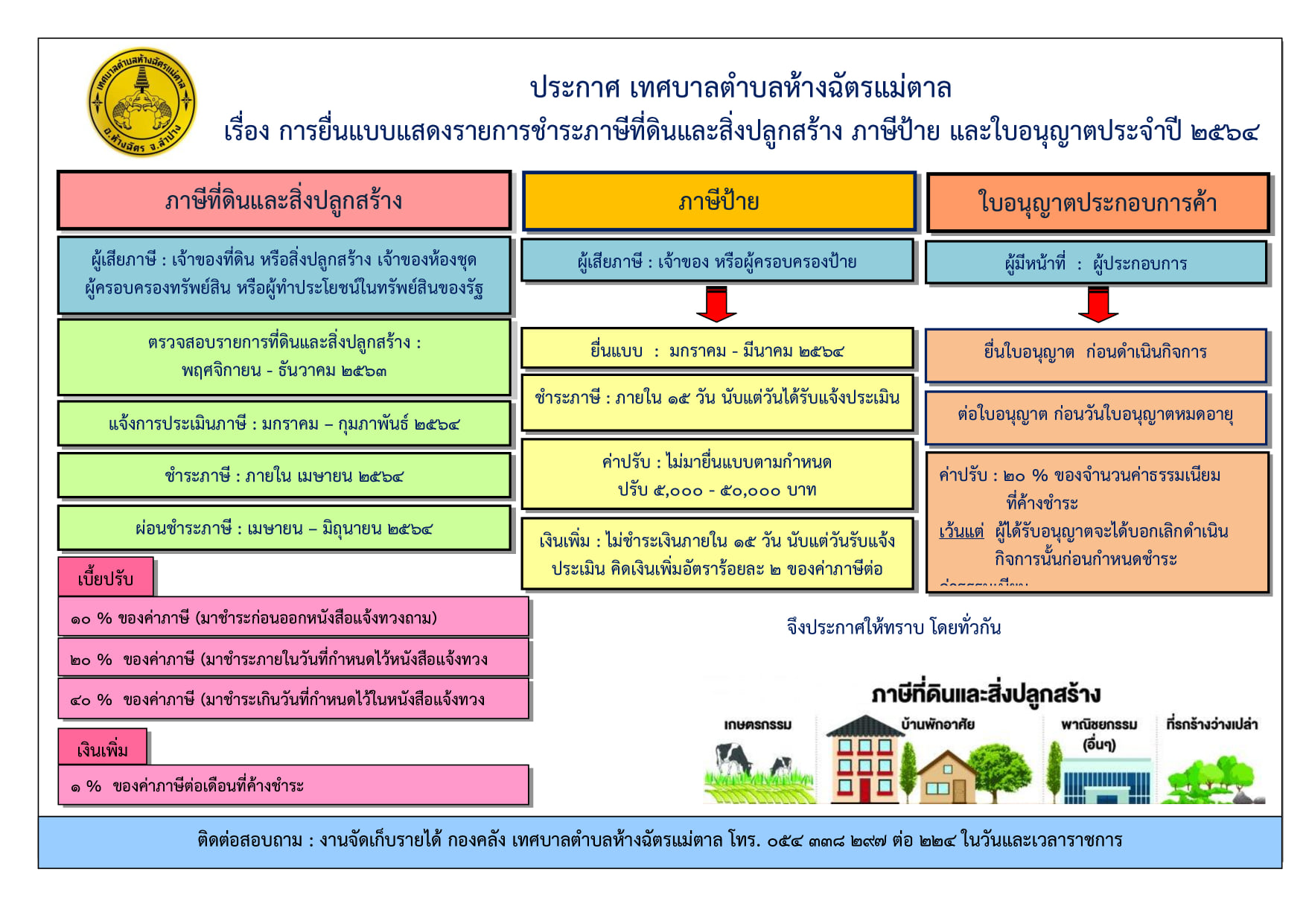 ประกาศ เทศบาลตำบลห้างฉัตรแม่ตาล แจ้งเรื่อง การยื่นแบบแสดงรายการชำระภาษีที่ดินและสิ่งปลูกสร้าง ภาษีป้าย และใบอนุญาตประจำปี 2564 ติดต่อสอบถามได้ที่ :: งานจัดเก็บรายได้ กองคลัง เทศบาลตำบลห้างฉัตรแม่ตาล