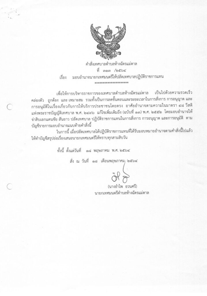 คำสั่งเทศบาลตำบลห้างฉัตรแม่ตาล เรื่อง การมอบอำนาจนายกเทศมนตรีให้ปลัดเทศบาลปฏิบัติราชการแทน